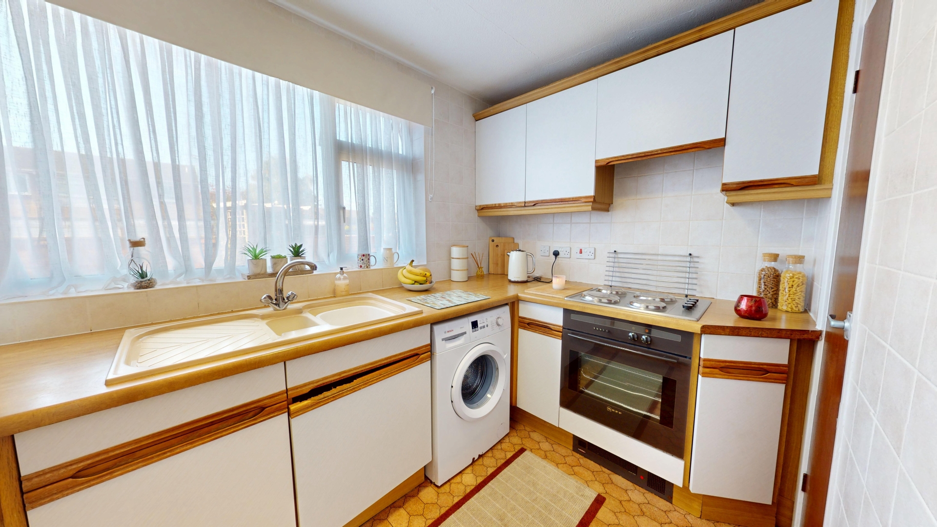 uPVC double glazed window to rear elevation. Fitted with a range of wall mounted and base level cabinets with roll top work surfaces over. Integrated appliances including fitted electric oven, four ring electric hob and extractor hood over. Space and plumbing for white goods. One and a half sink and drainer unit. Cupboard. Tiled walls.