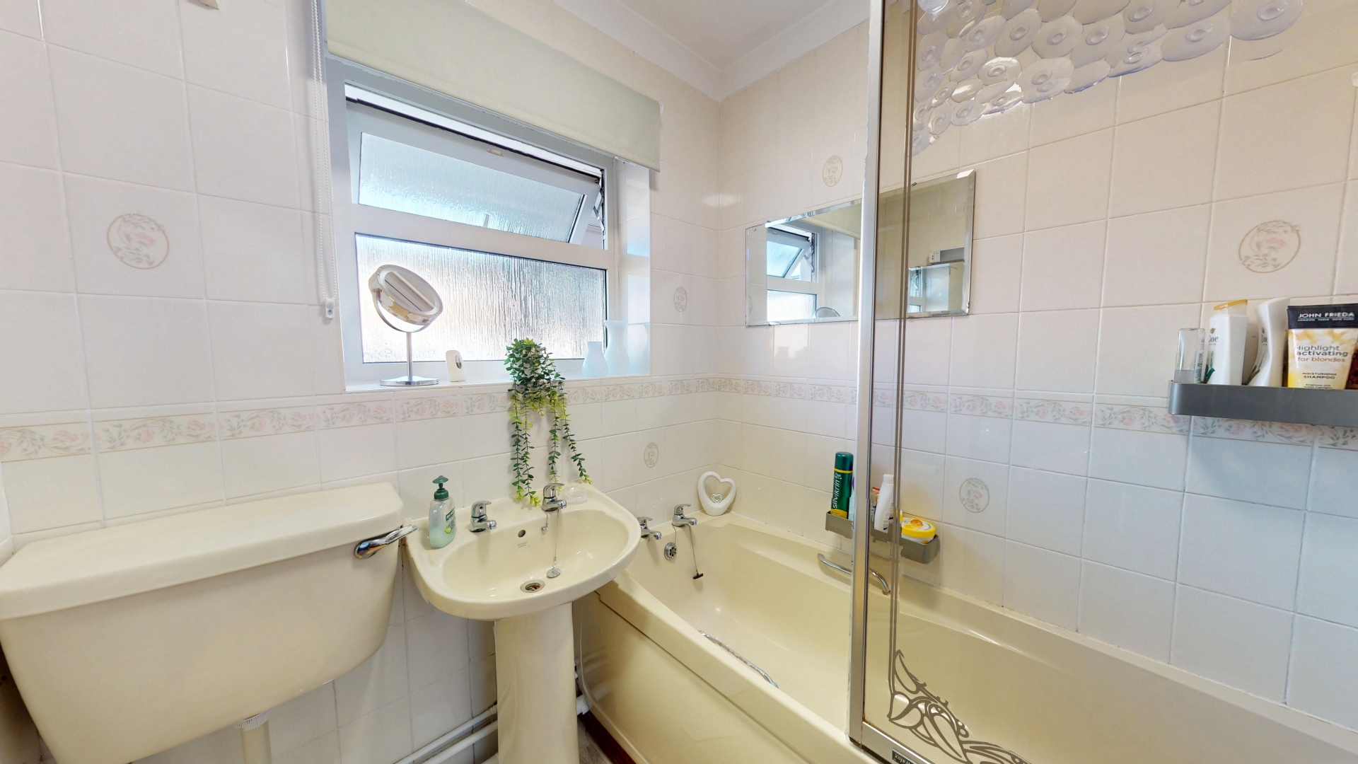 Double glazed window to side elevation. Fitted with a three piece suite including panelled bath with shower over, pedestal wash hand basin and low level WC. Tiled walls. Airing cupboard.