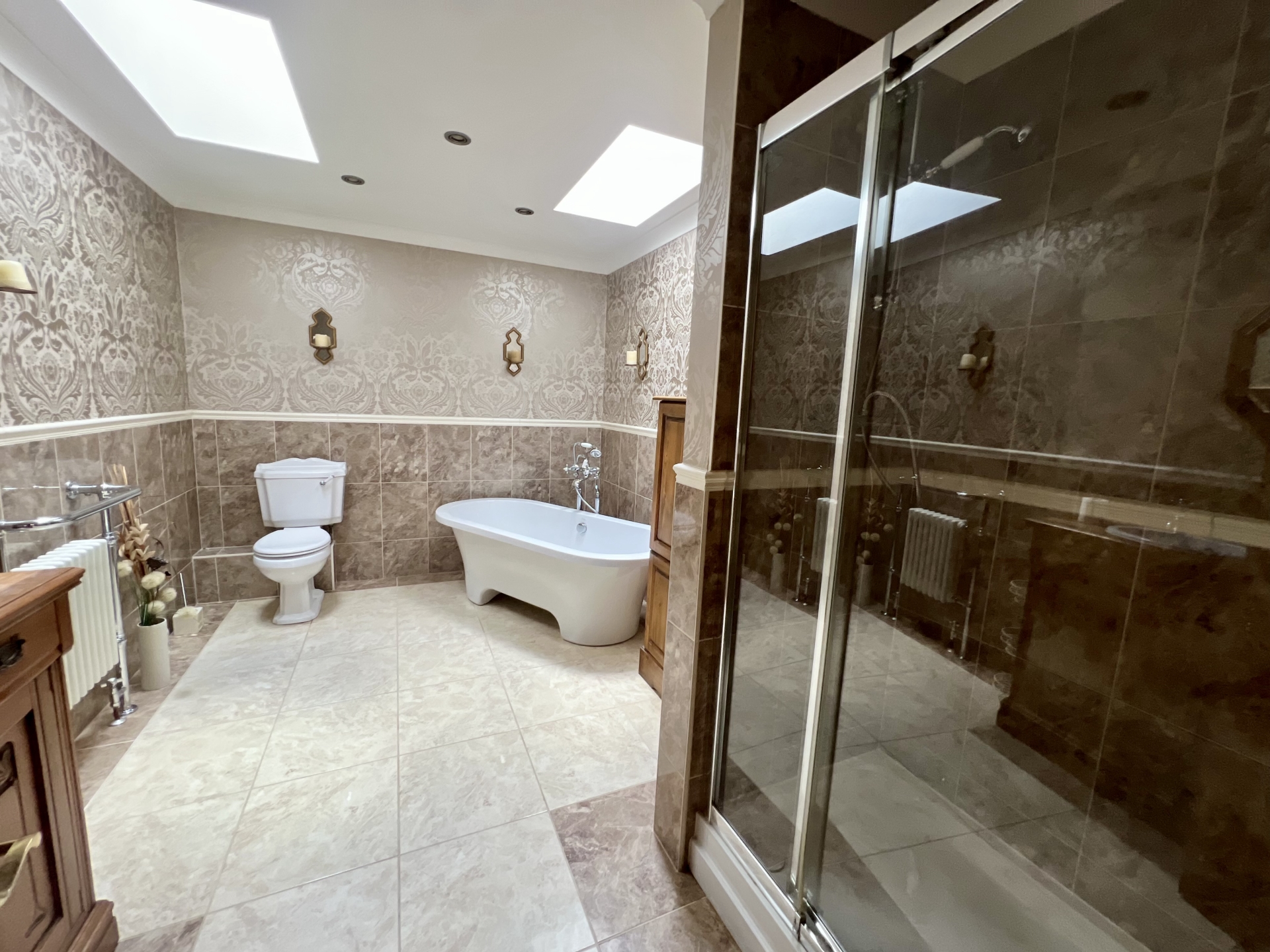 Skylight. Full height tiling. Corner shower cubicle. Low level WC. Wash hand basin in vanity unit.
