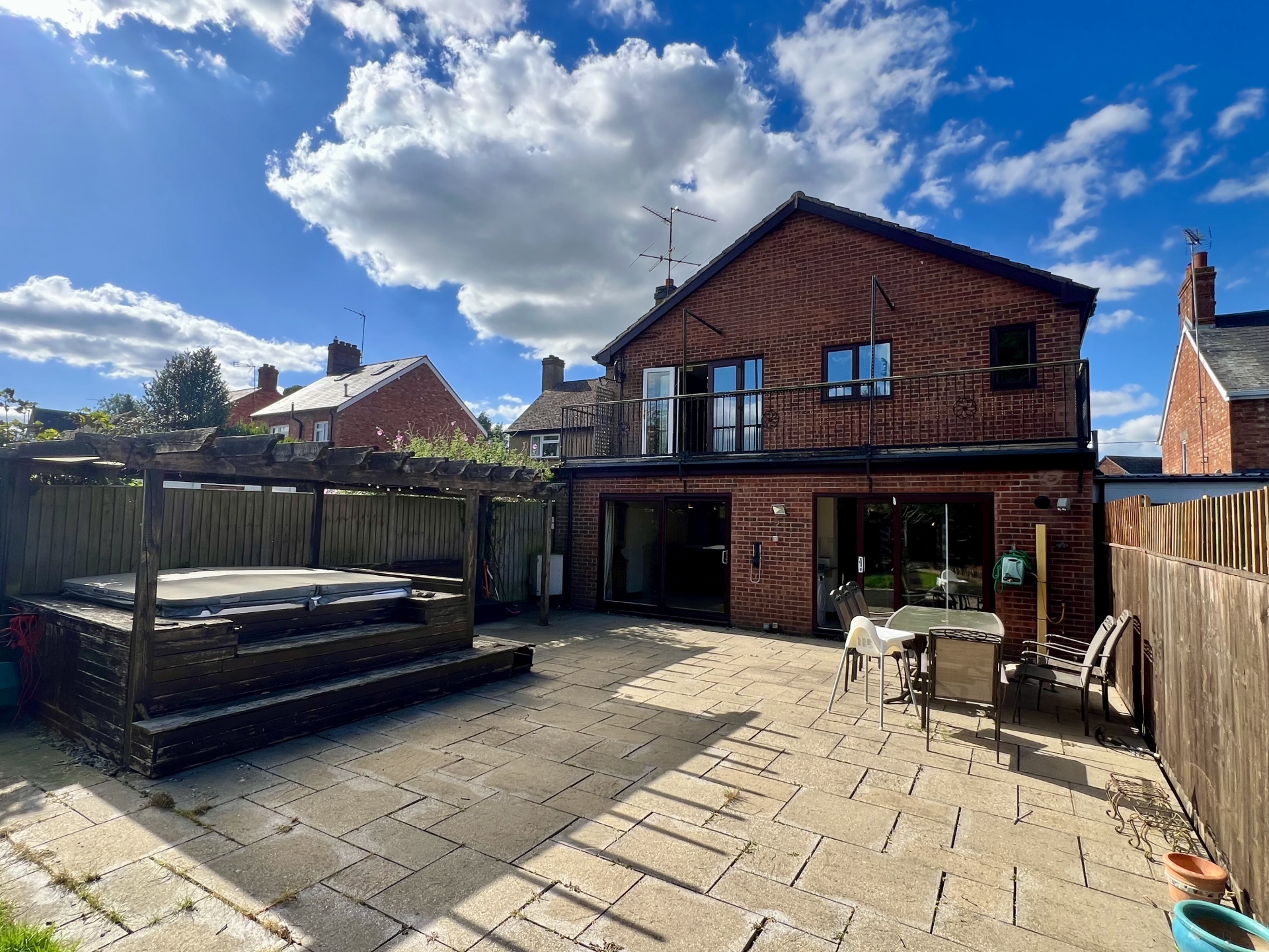 Low maintenance rear garden benefitting from a generous patio entertainment area. Built in hot tub. Lawned area.