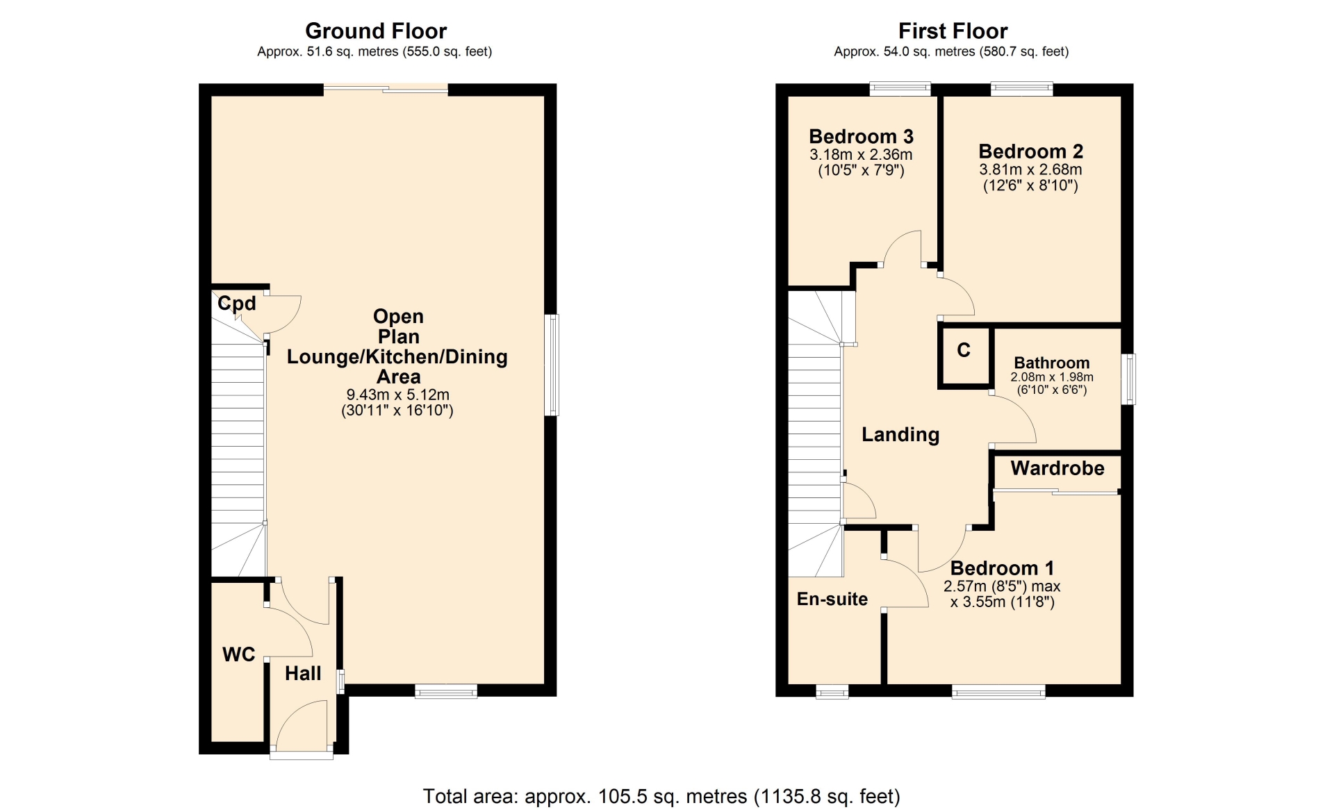 BEDROOM ONE 2.57m x 3.55m (8'5" x 11'7")
