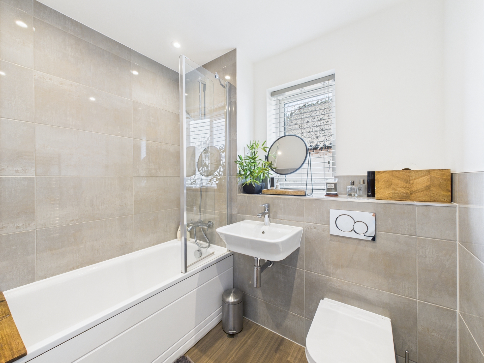 uPVC obscure double glazed window to side elevation. Chrome heated towel rail. Suite comprising bath with shower over, wash hand basin and low level WC. Tiling to half height.