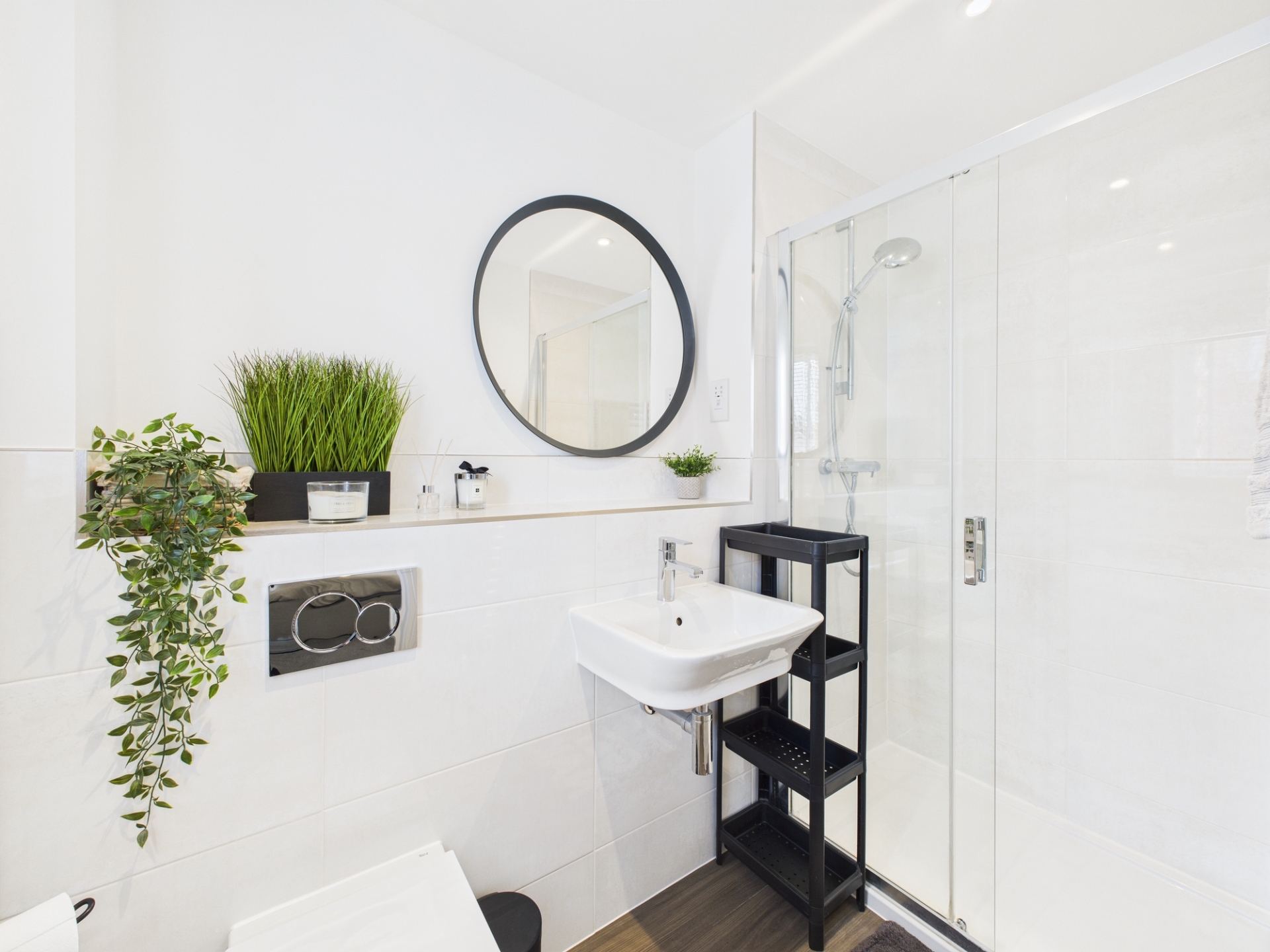 uPVC obscure double glazed window to front elevation. Chrome heated towel rail. Suite comprising double shower cubicle with full height tiling, wash hand basin and low level WC.