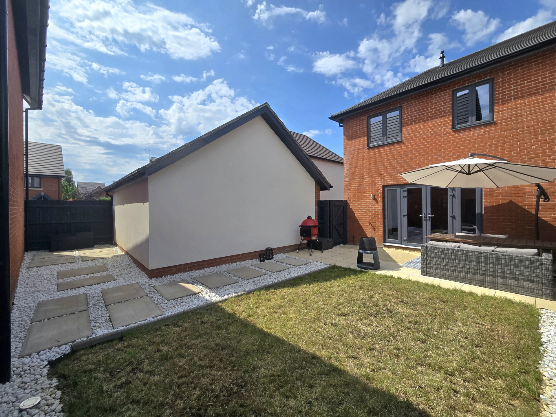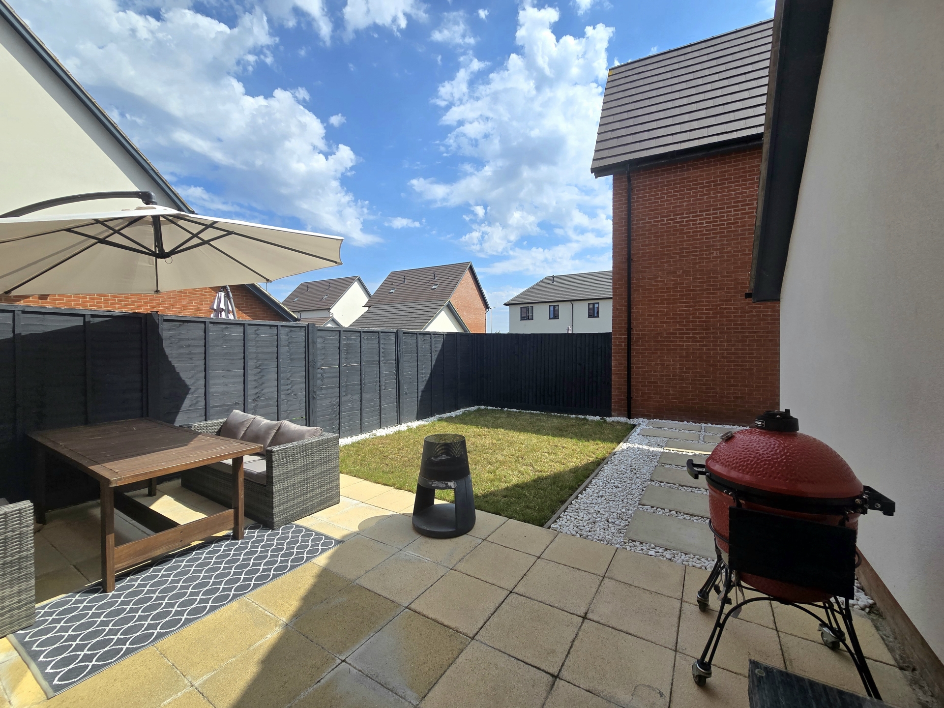 Patio entertainment area stretching width of property. Area of decorative stone and a lawned space enclosed via mix of brick wall and wooden fencing. Side access to driveway.