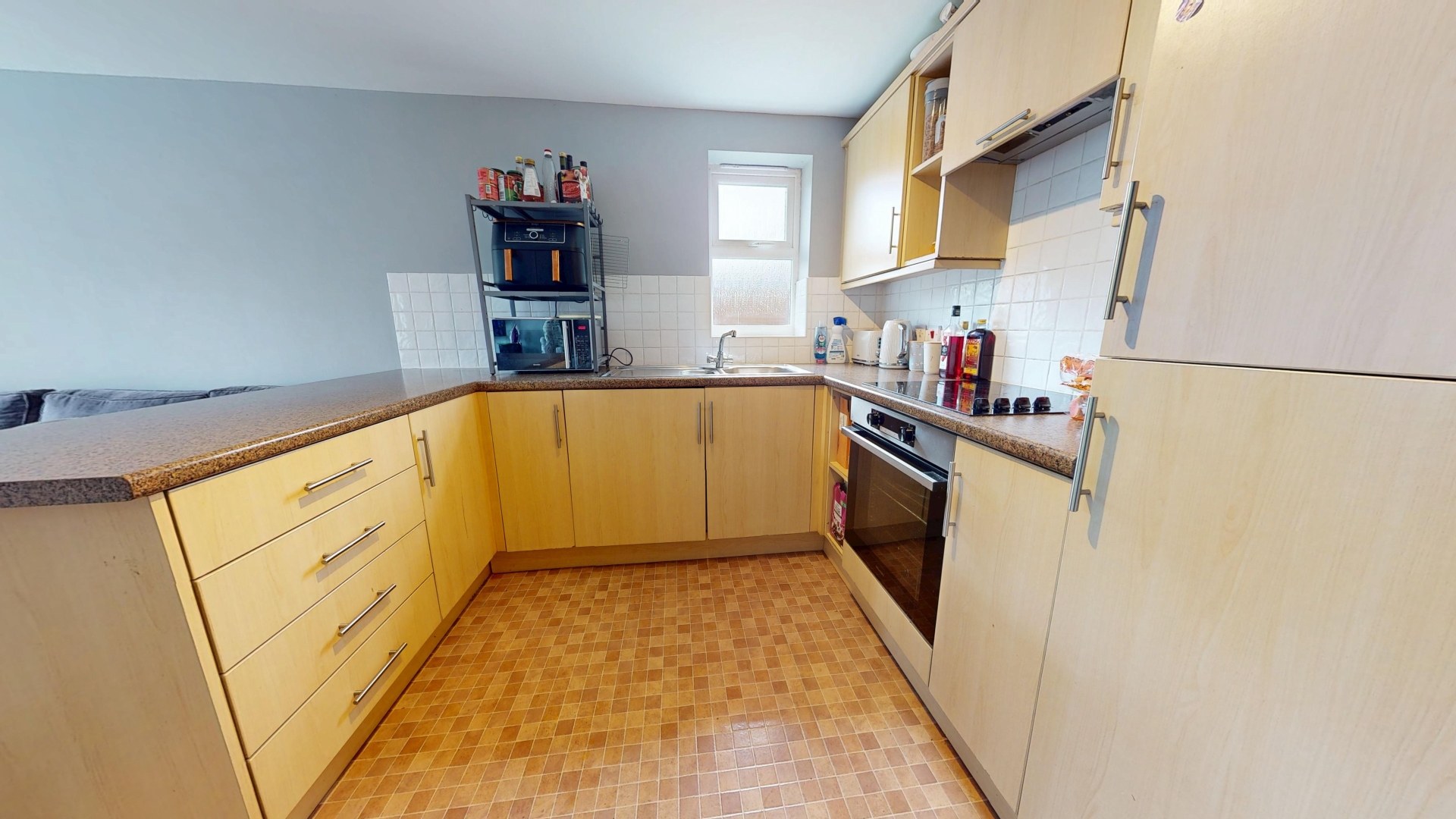 Two uPVC double glazed windows to front elevation. Obscure uPVC double glazed window to side elevation. Wall and base units. Roll top work surfaces. Stainless steel sink and drainer. Induction hob, oven and concealed extractor hood. Integrated fridge/freezer. Vinyl flooring. Tiling to splash areas. Two radiators.