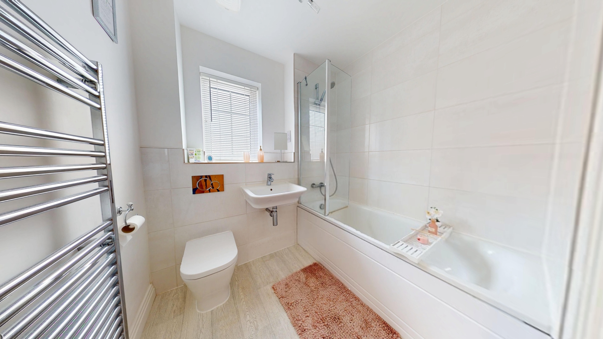 uPVC obscure double glazed window to side elevation. Low level WC, wall mounted wash hand basin and bath with shower over. Chrome heated towel rail. Tiling to splash areas.