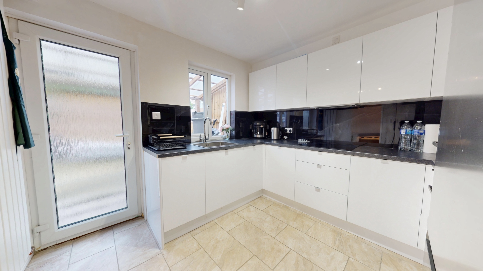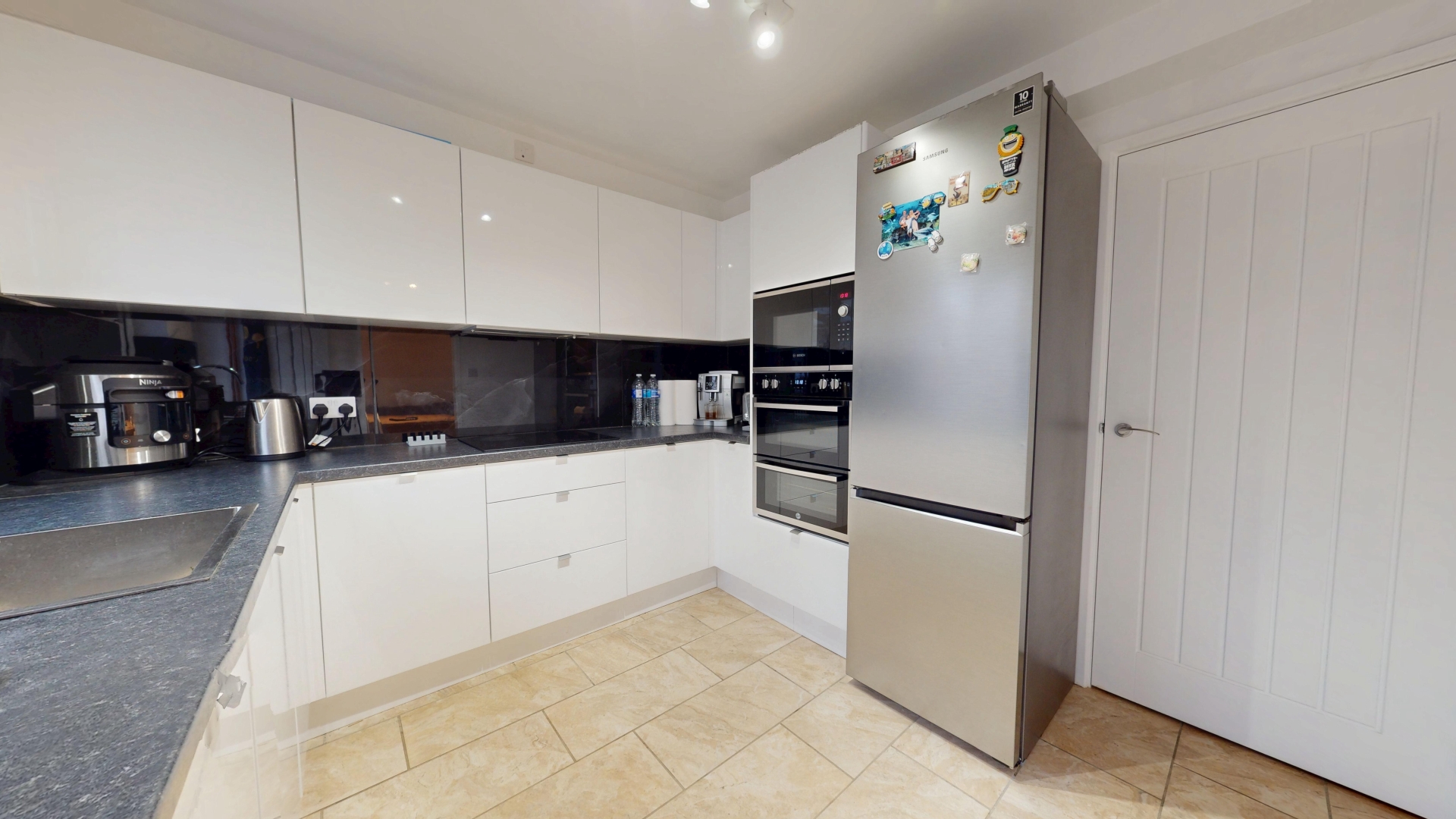 Double glazed window to rear elevation. Obscure double glazed door leading to garden. Radiator. Fitted wall mounted and base units with work surface over. Stainless steel sink with mixer tap. Built in slimline Bosch dishwasher. Bosch induction hob with extractor hood over. Gas cooker point. Built in Hoover eye level oven. Bosch microwave. Space for fridge freezer. Tiled floor and doorway into dining room.