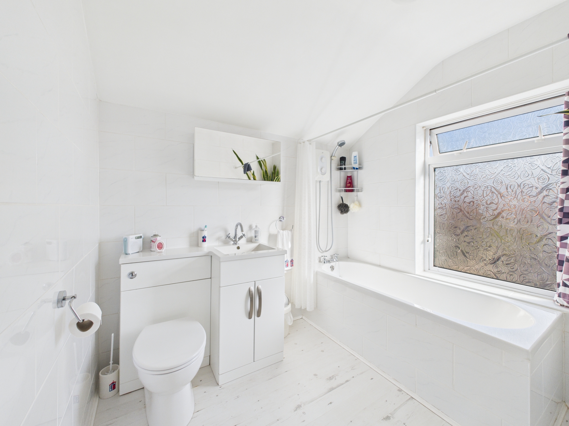 uPVC double glazed opaque window to rear elevation. Radiator. Three piece suite comprising panelled bath with shower over, low level WC and hand wash basin in vanity unit.