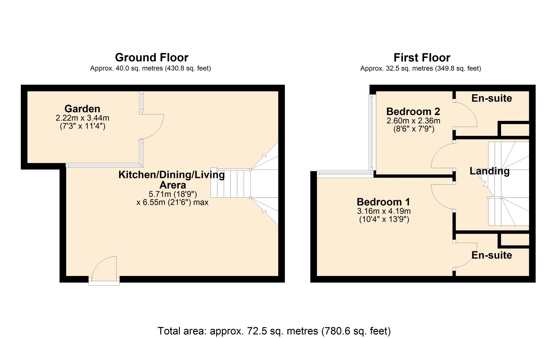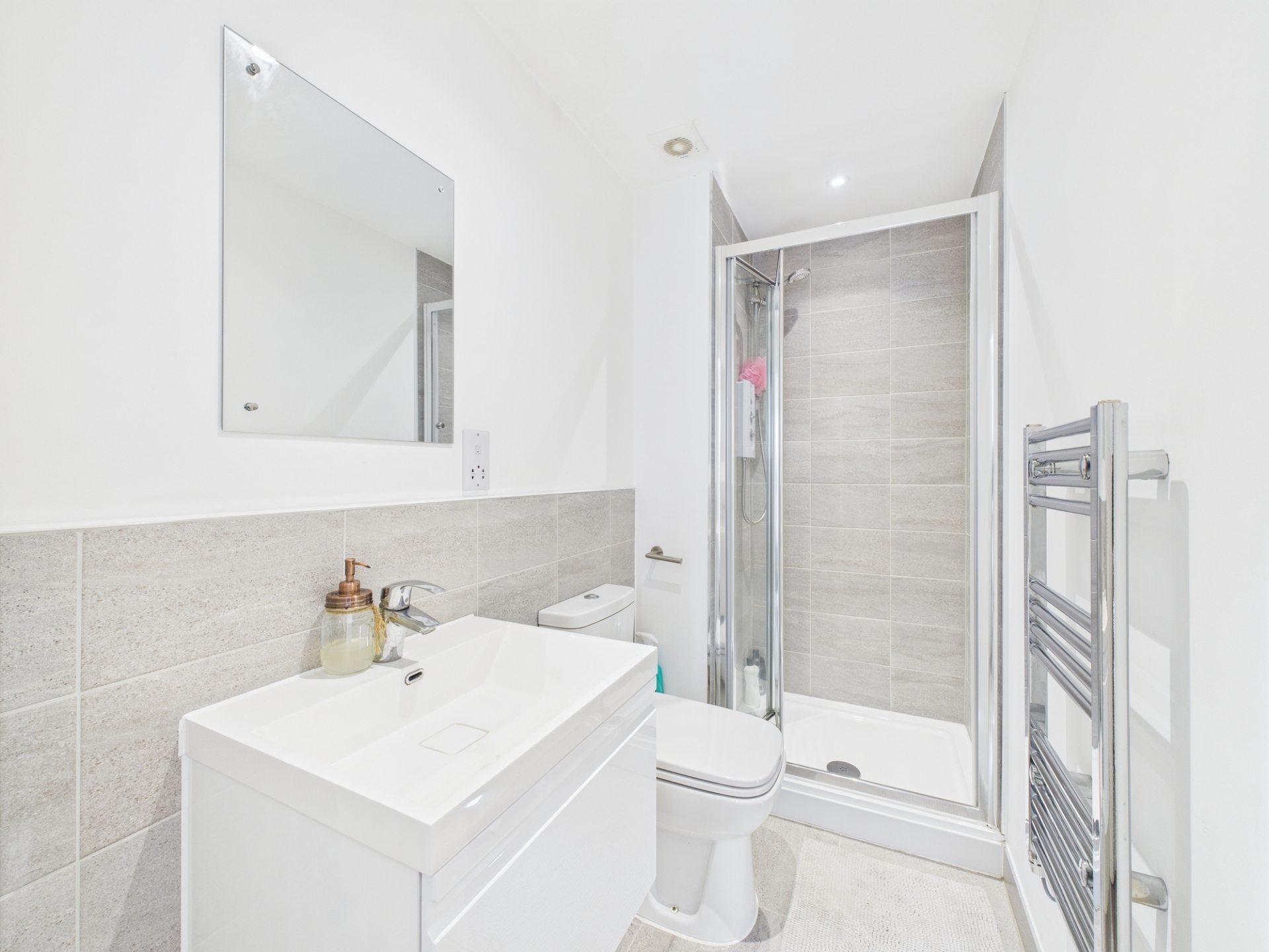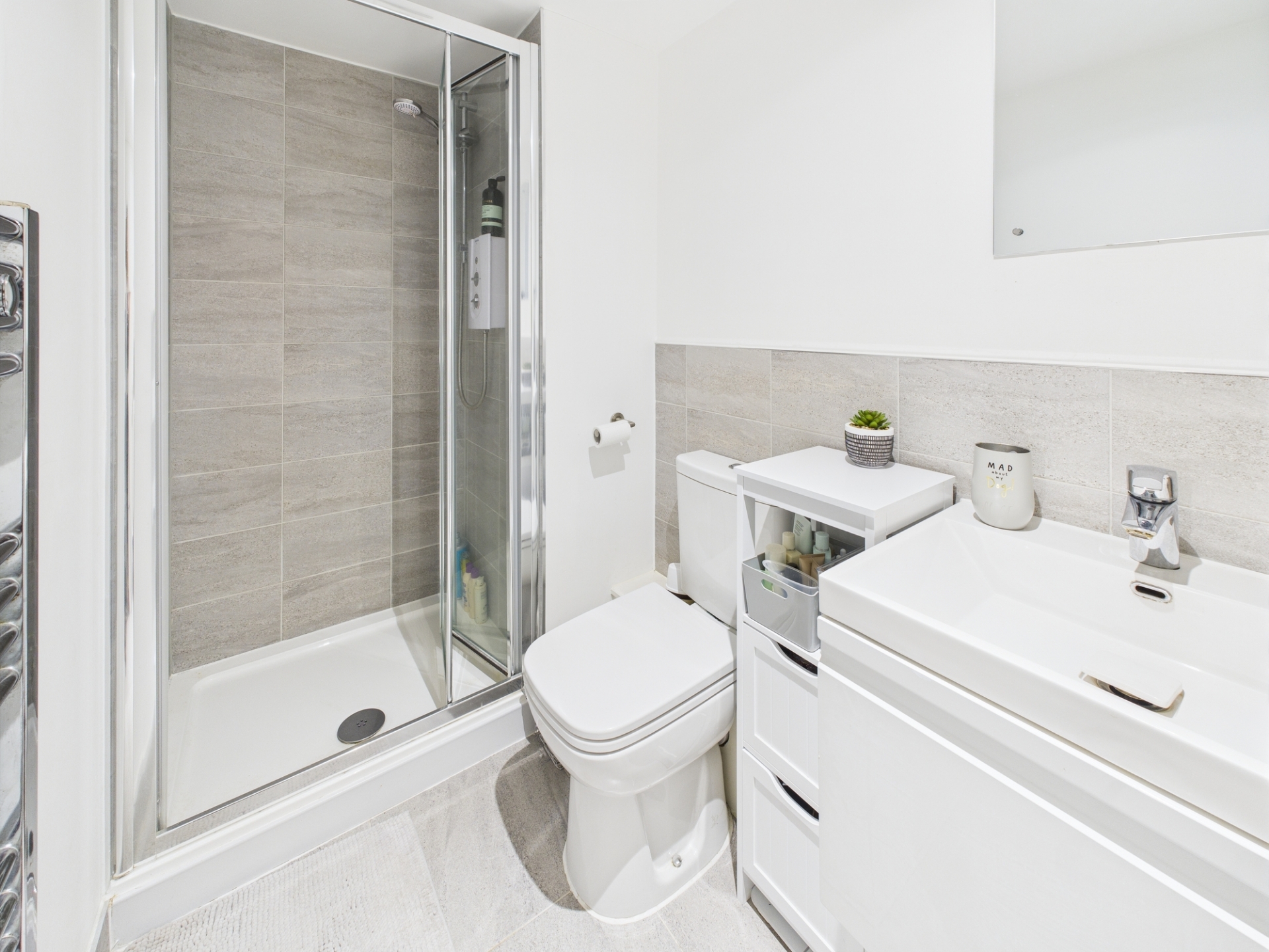 Upstairs are two bedrooms, both with en-suite shower rooms.