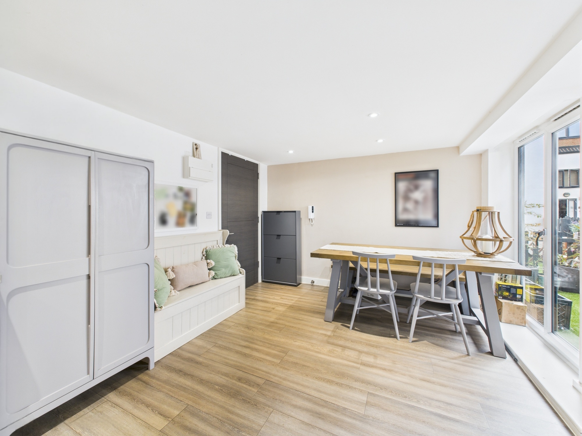 The ground floor features a bright, open plan living area with ample space for dining and a modern fitted kitchen with integrated appliances. Patio doors open to a low maintenance private garden.