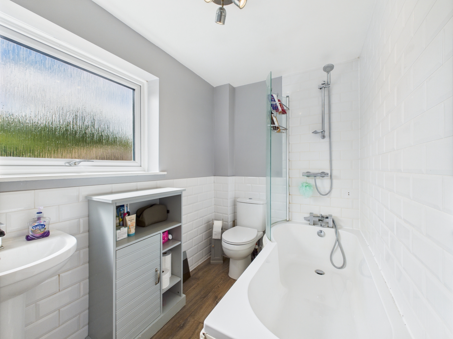 Low level WC. Heated towel rail. Pedestal wash hand basin. Bath with shower over.