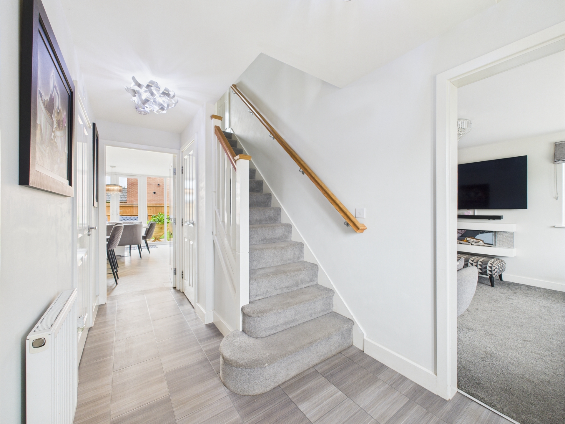 Stairs to first floor. Understairs storage cupboard. Radiator. Tiled floor.