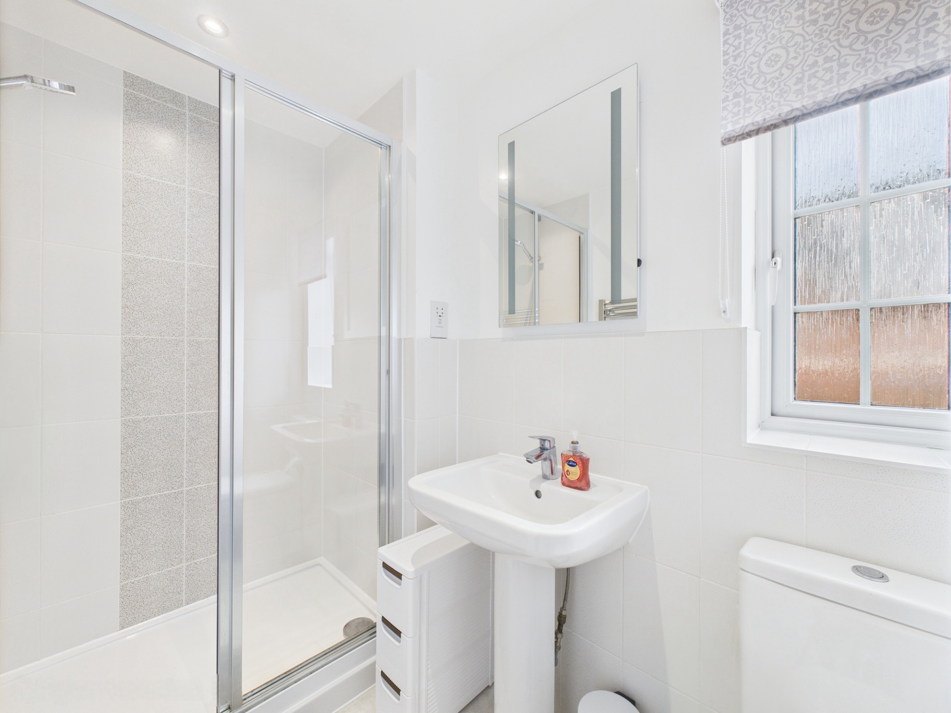 Window to side elevation. Shower in a large tiled cubicle. WC and wash hand basin. Tiled splashback and floor. Heated towel rail.