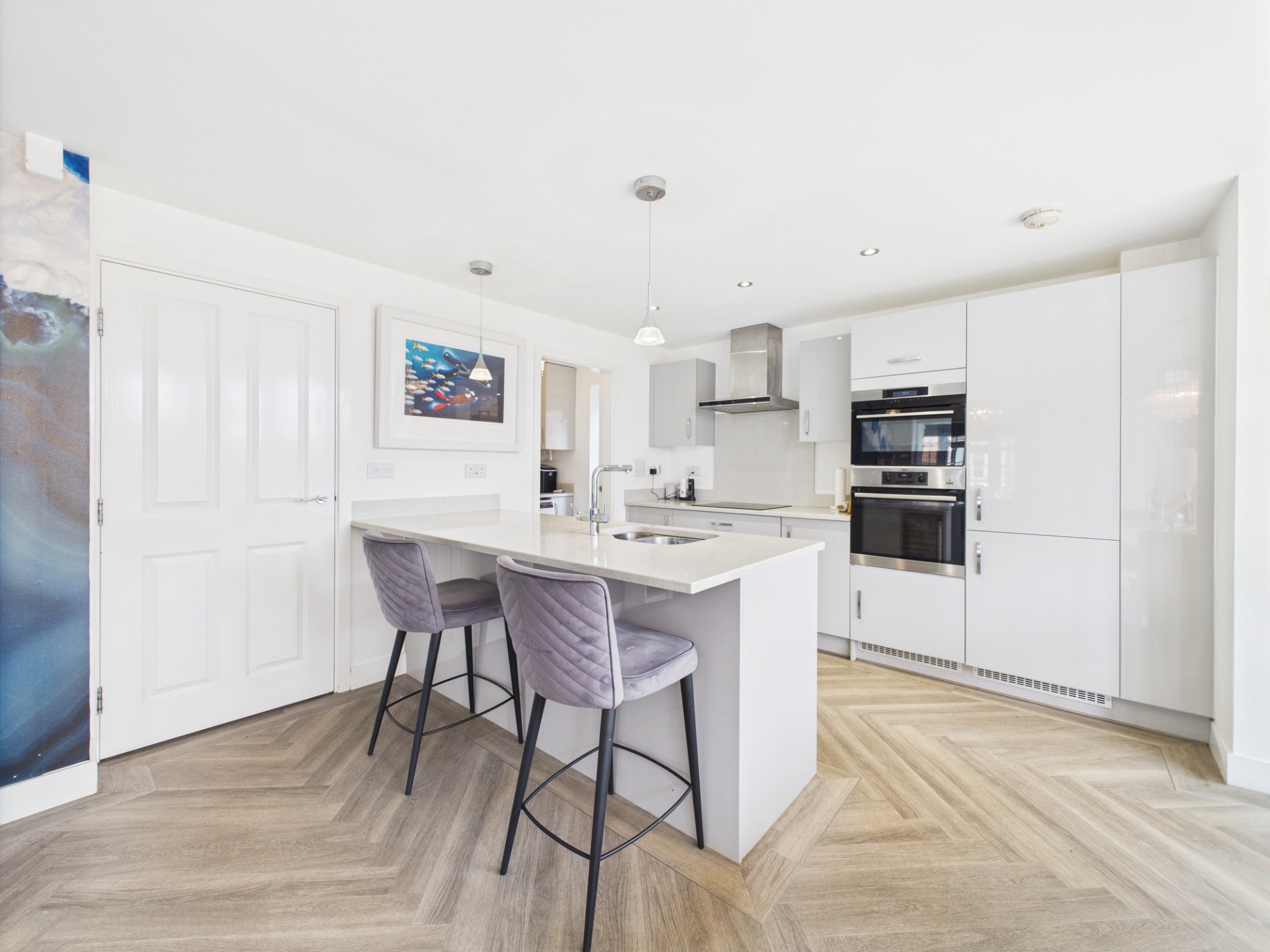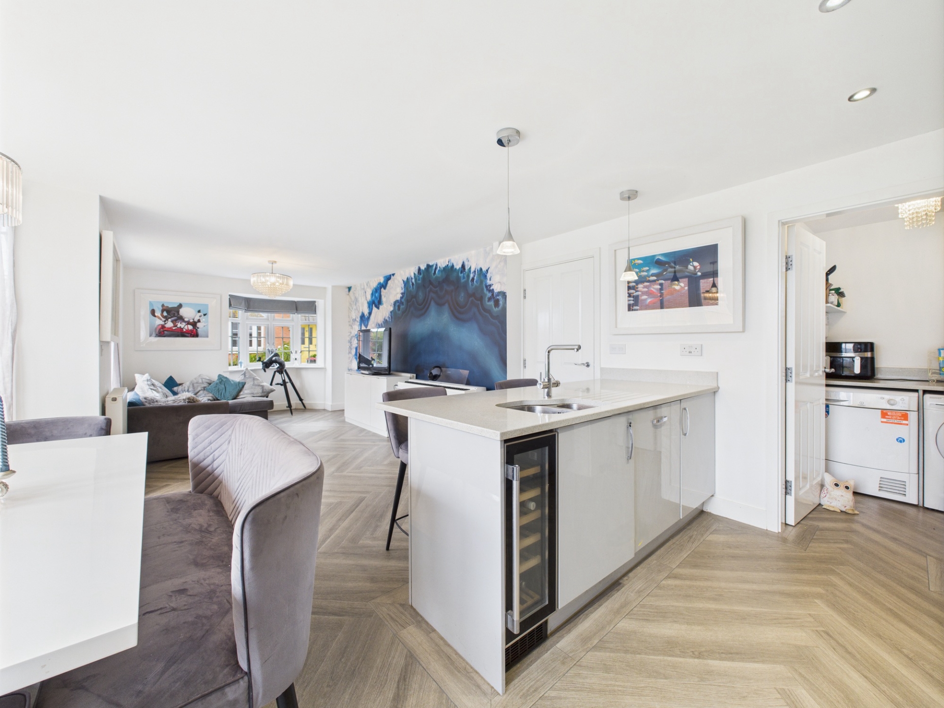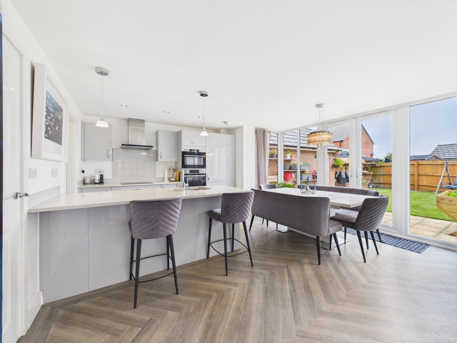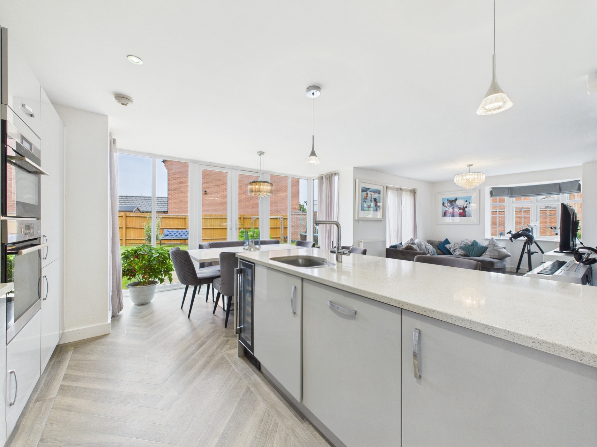 Bay window to side elevation. Two radiators. Wall mounted and base level units with quartz work tops. Built in oven and combi oven, induction hob with extractor. Fully integrated fridge freezer. Wine cooler. Breakfast bar. One and a half sink unit. Tiled floor. Twop sets of double doors to the rear with full height windows.