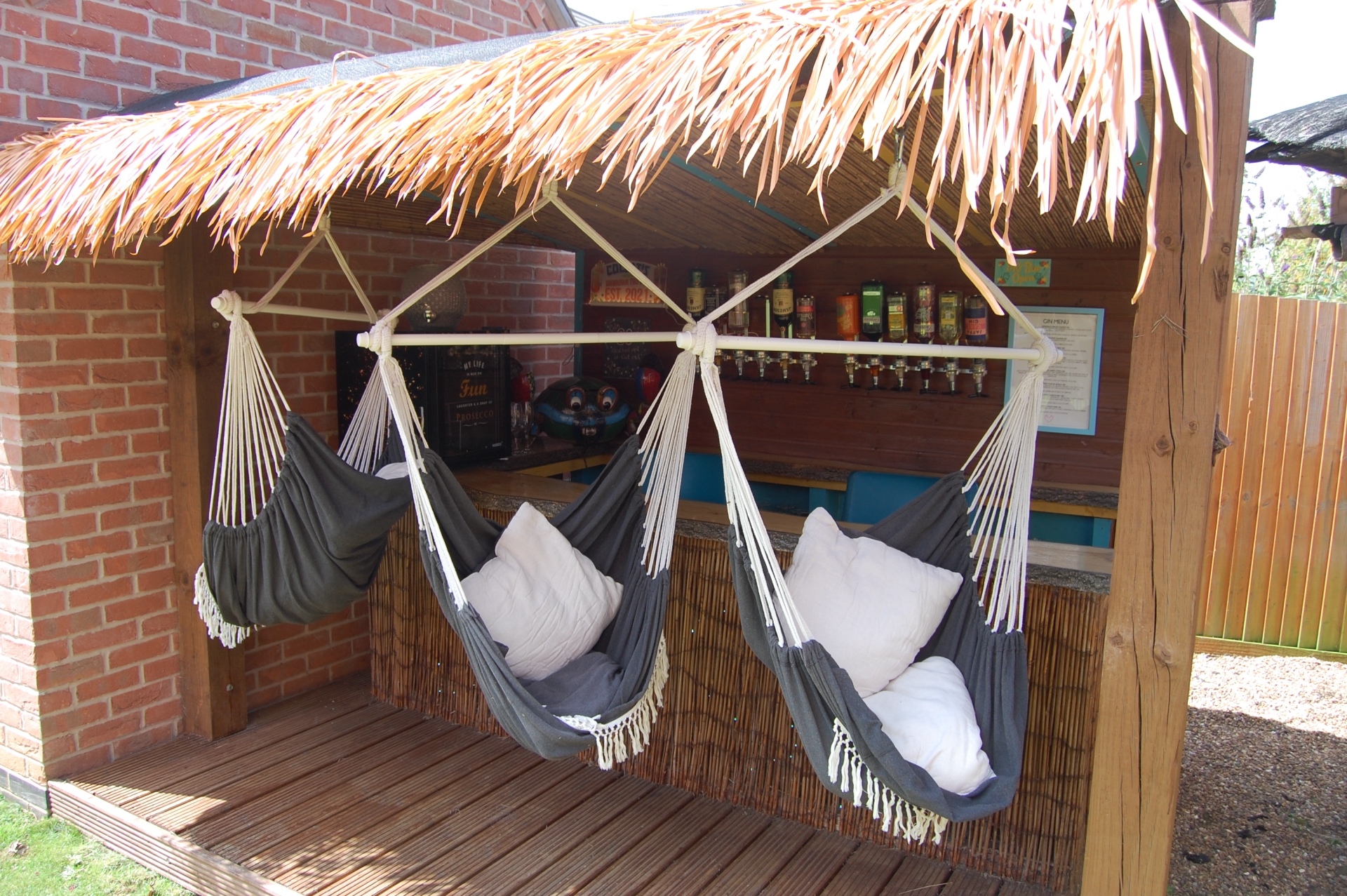 Paved and decked seating area. The rest is laid to lawn. Covered bar and seating area with heat lamps.