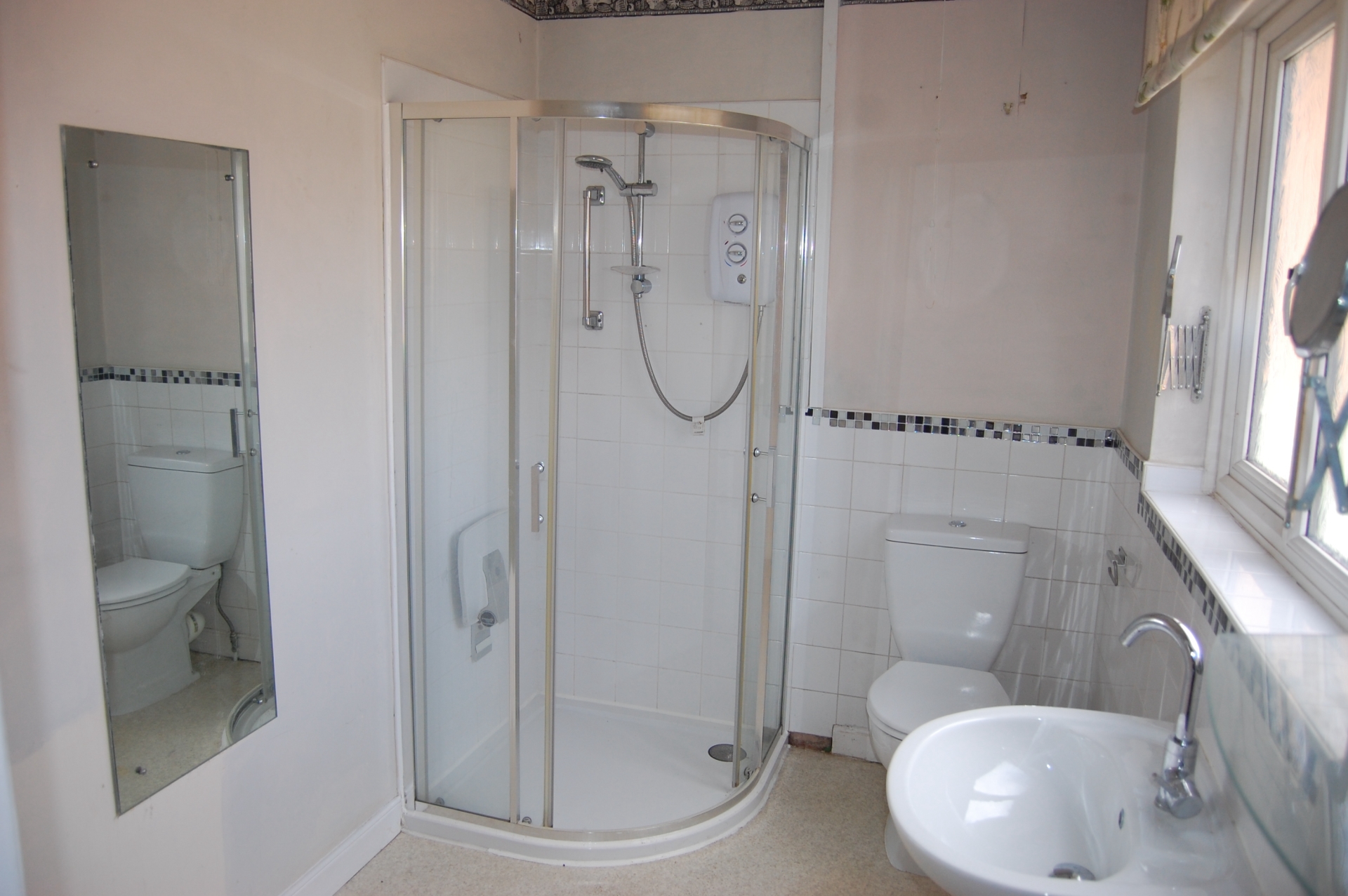Window to side elevation. Radiator. Suite comprising shower in a tiled cubicle, WC and wash hand basin.
