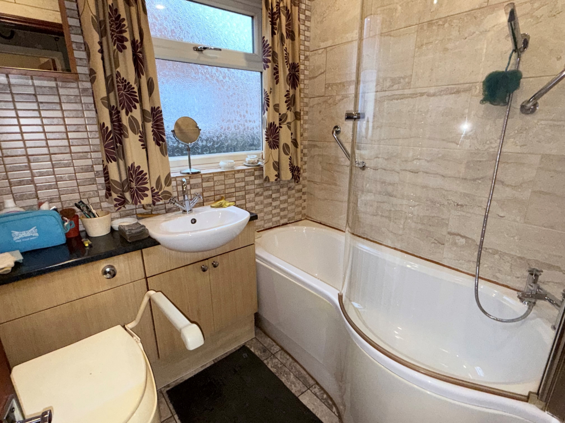 Obscure uPVC double glazed window to side elevation. Panel bath with mixer tap and shower over. Wash hand basin and WC in vanity unit with mixer tap. Tiled splashbacks. Heated towel rail. Tiled floor. Extractor.