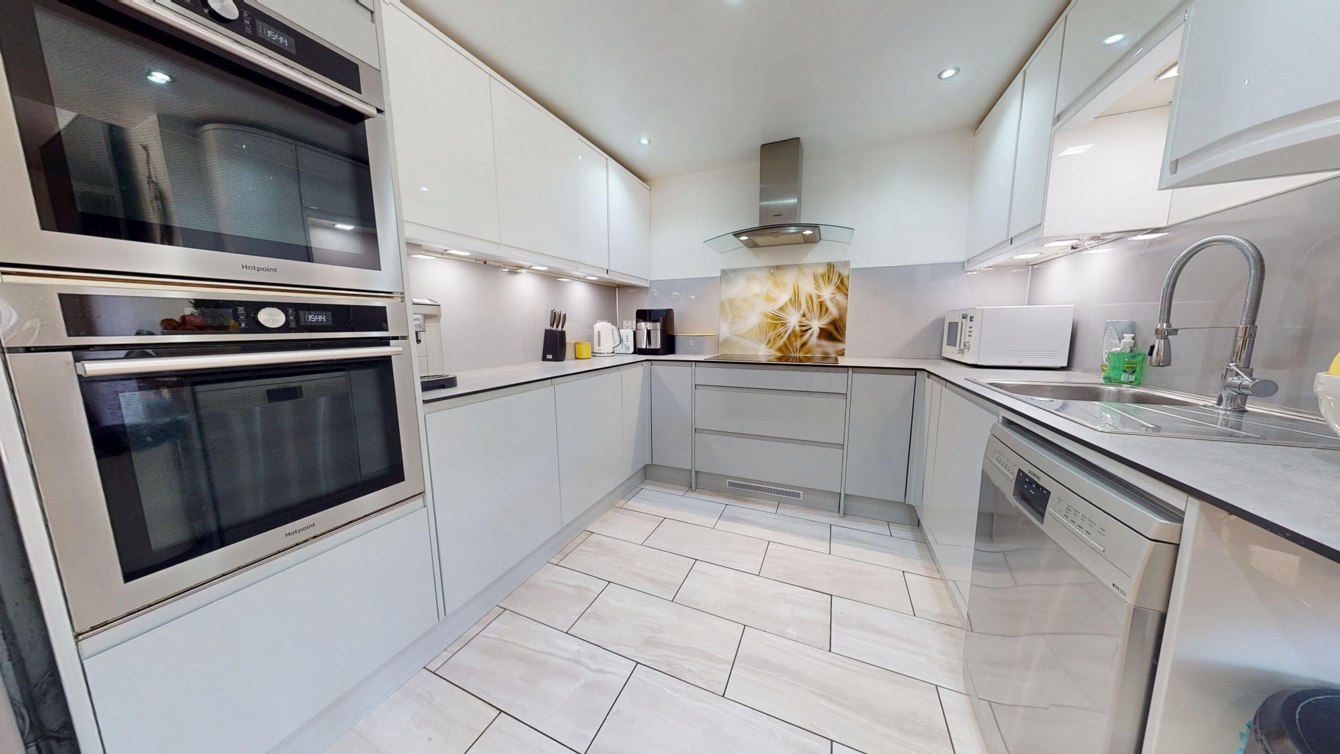 uPVC double glazed French doors to rear elevation. Laminate flooring. Splash back tiling. A range of base and wall units. Stainless steel sink and drainer with stainless steel mixer tap. Induction hob and extractor hood, high level double oven. Tiled flooring. Space for white goods. Wall mounted decorative radiator. Storage cupboard. Access to bedroom four and shower room.