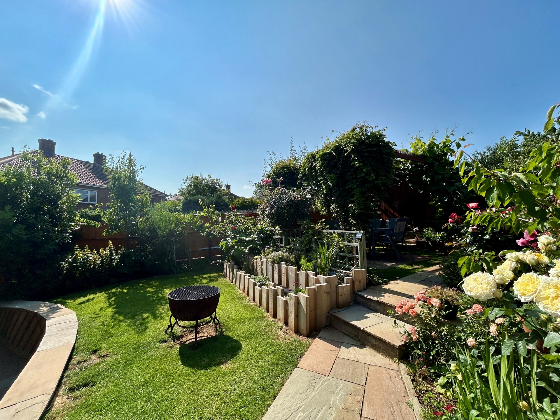 Fully landscaped, with generous patio stretching across the width of the property. A range of shrubs bushes and trees bordering the property. Wood store to the head of the garden and a pergola style entertainment area. Storage shed