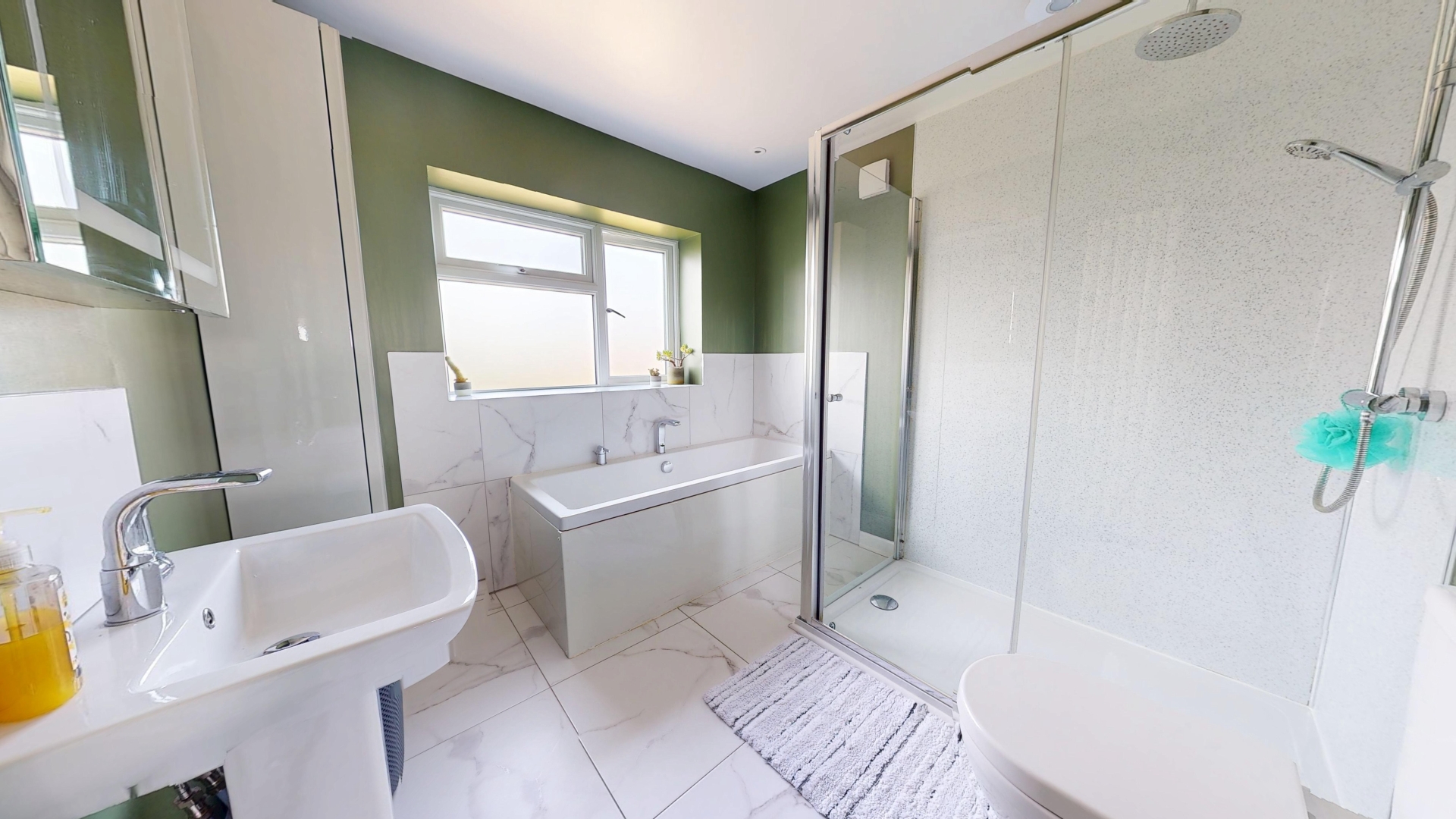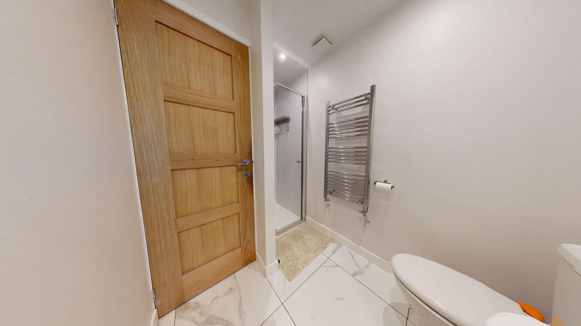 uPVC double glazed window to rear elevation. Chrome heated towel rail. Suite comprising corner shower cubicle, wash hand basin and low level WC. Tiling to splash back areas.