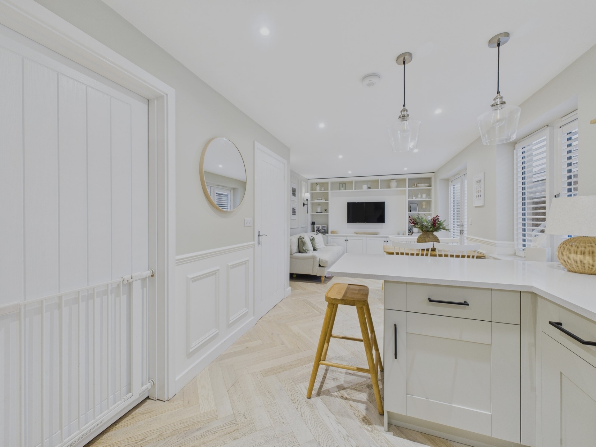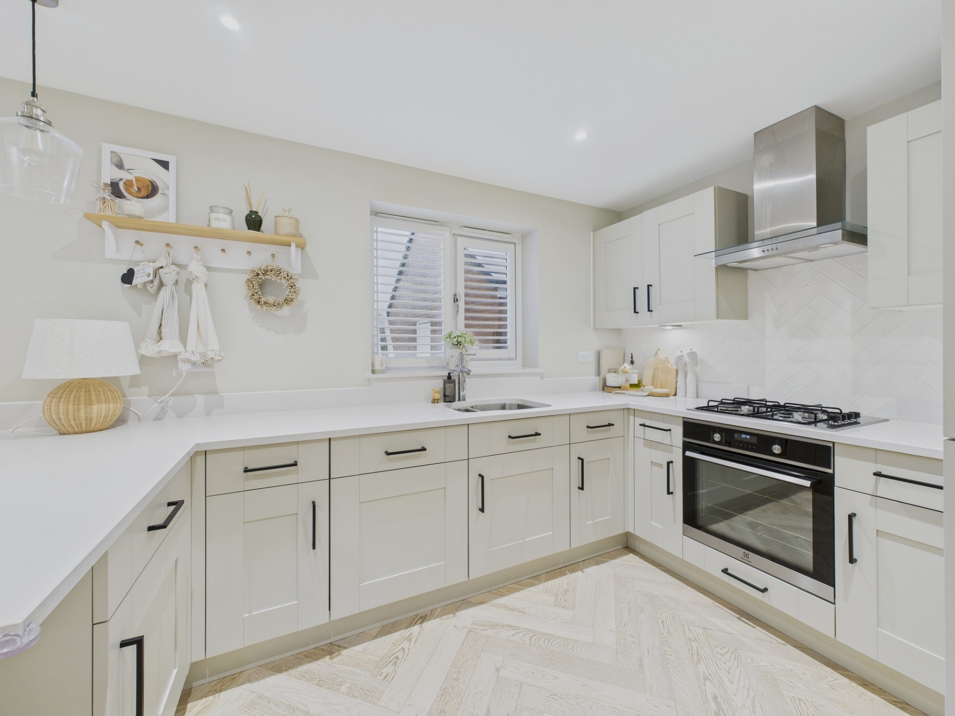 uPVC double glazed window to side elevation. Hardwood herringbone flooring. Base and wall mounted units with Quartz worktop over. Tiled splashbacks. Boiler. Space for washing machine and tumble dryer.