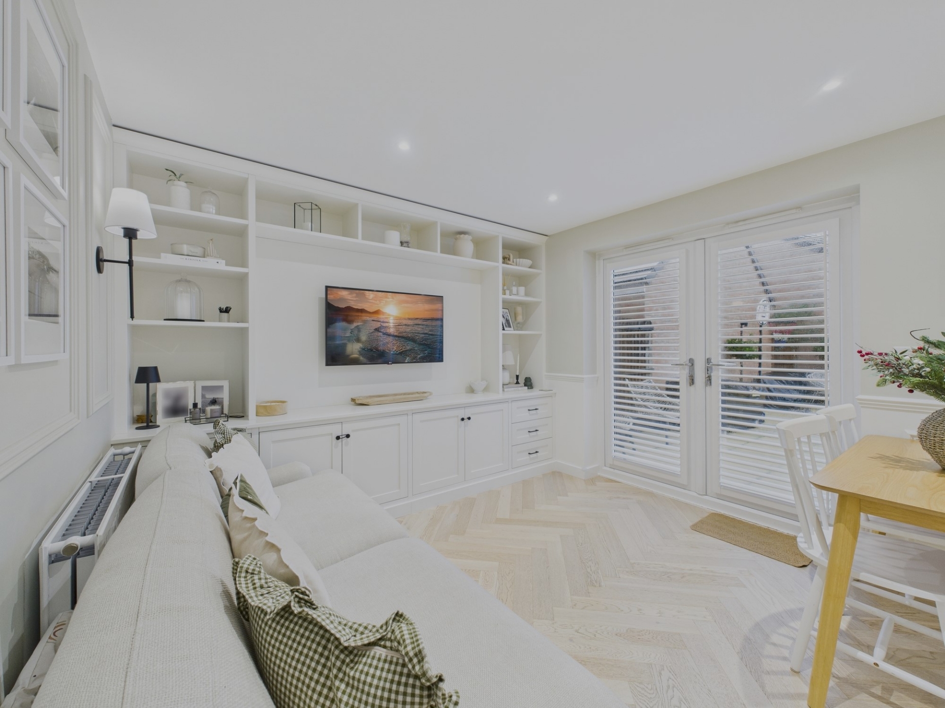 uPVC double glazed front door. Two uPVC double glazed window to rear elevation, both with added plantation shutters. Two radiators. Hardwood herringbone flooring. Panelling to walls. Built in cupboards and shelves. Base and wall mounted units with Quartz worktop over. Integrated fridge freezer, dishwasher, gas hob and electric oven. One and a half bowl sink with tiled splashbacks.