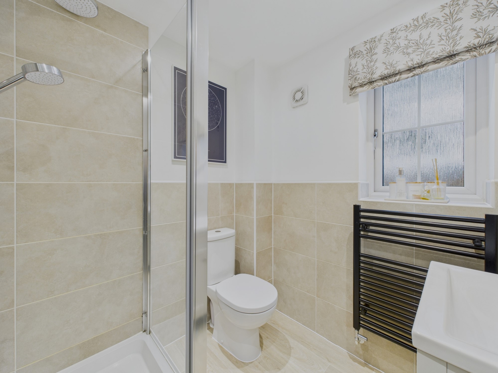uPVC double glazed window to front elevation. Wood effect vinyl flooring. Tiled half wall and shower. Low level WC. Towel radiator. Wash hand basin in vanity unit.