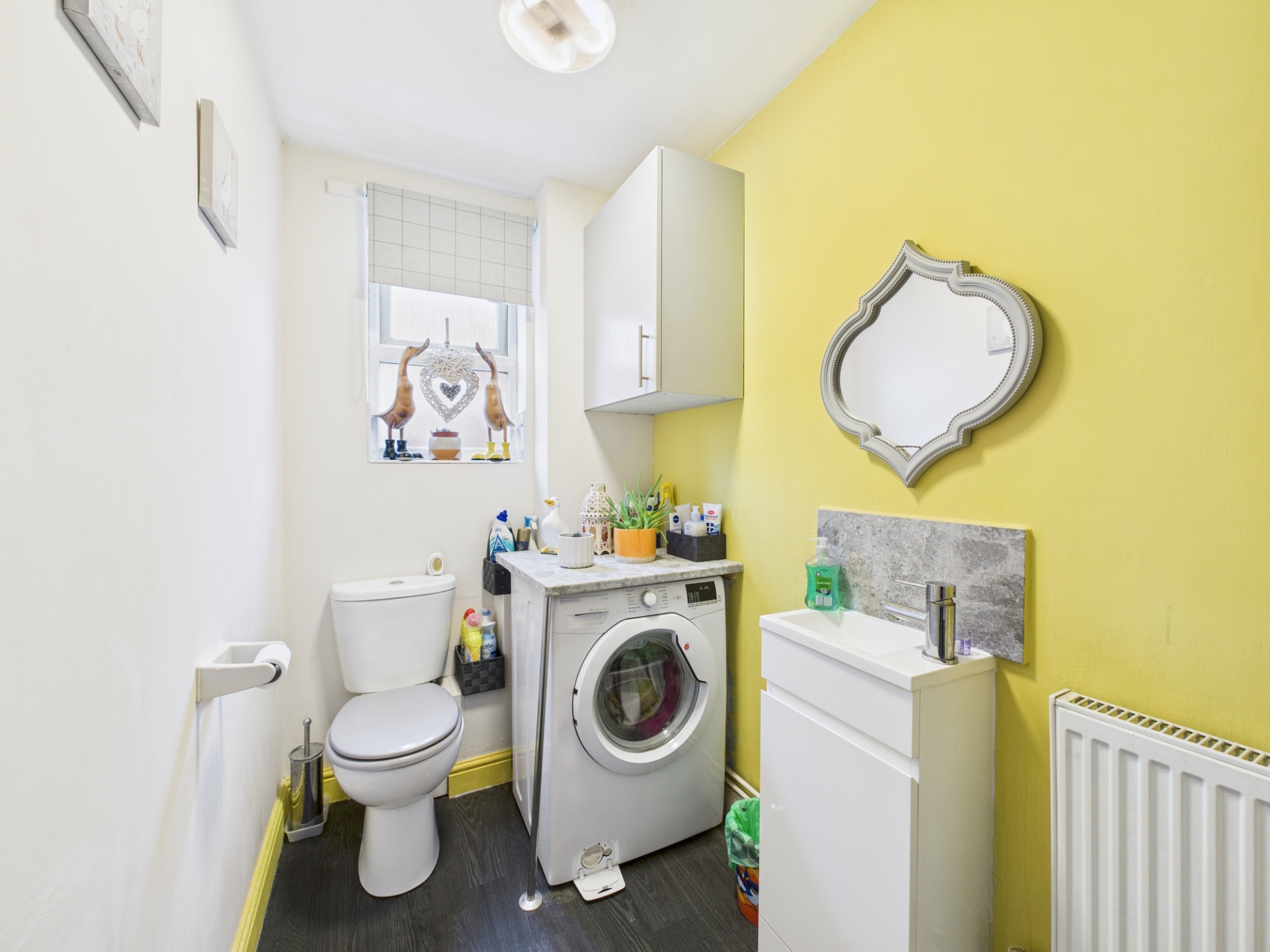Obscure double glazed window to side elevation. Radiator. Sink with vanity unit and low level WC. Plumbing for washing machine.