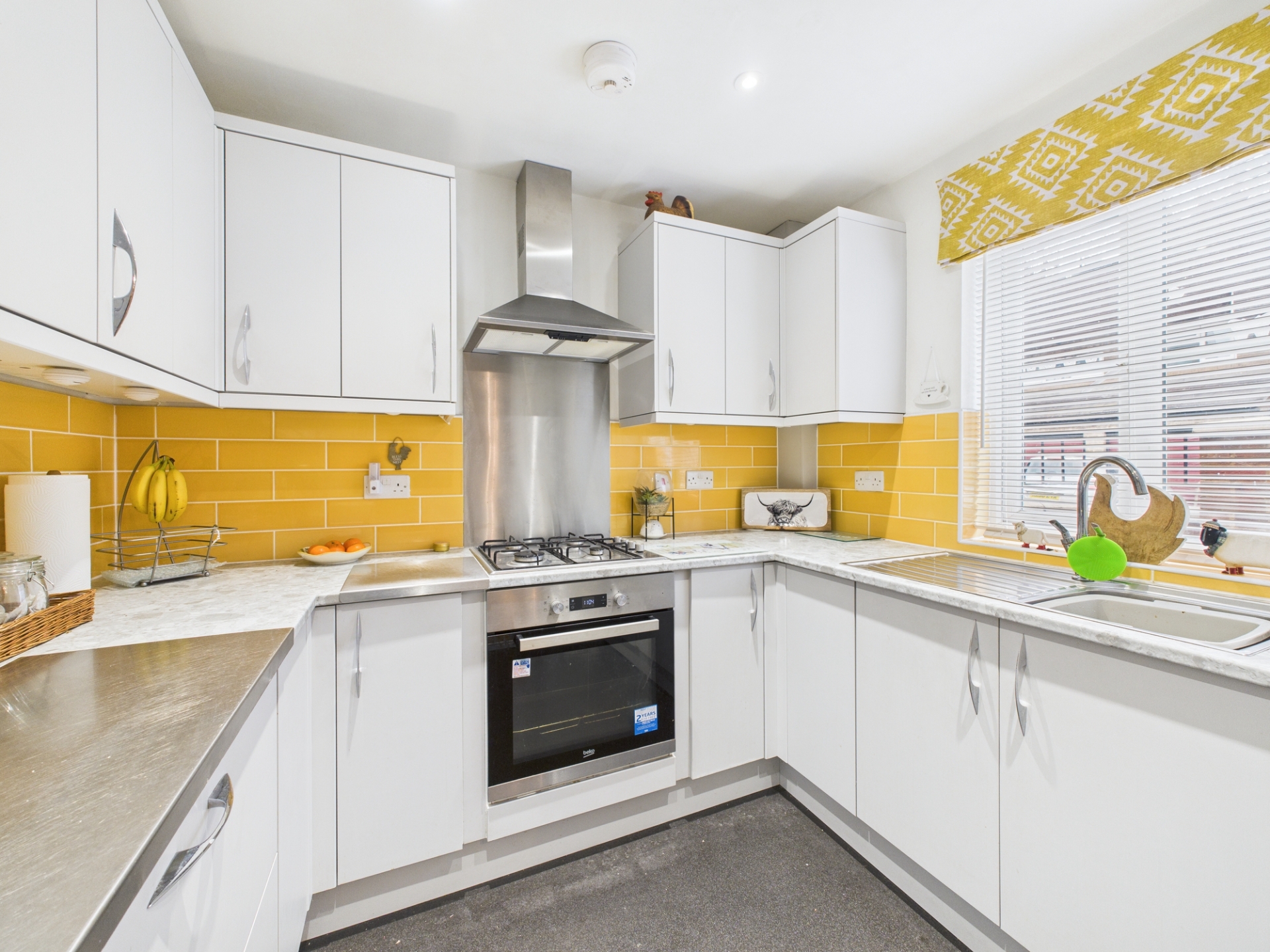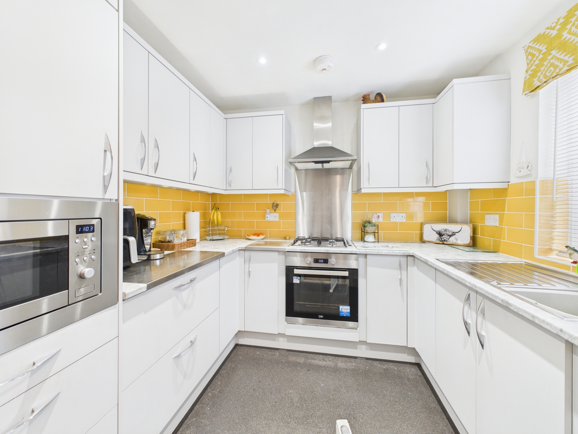 Double glazed window to side elevation. Magnet wall and base units. Built in microwave. Gas hob, oven and extractor. Integrated fridge/freezer.