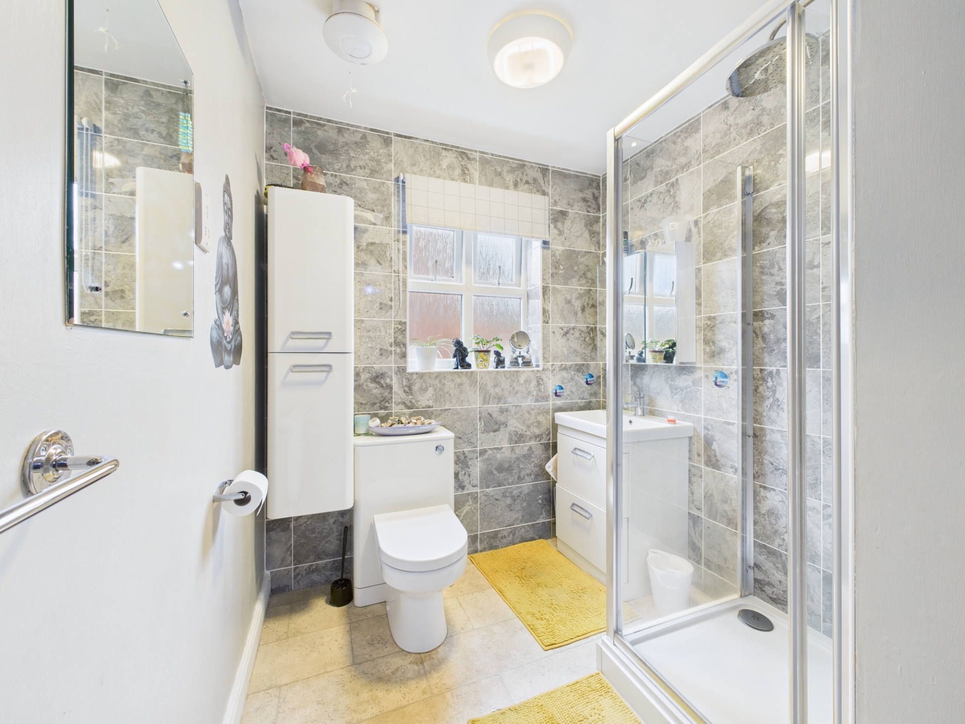 Obscure double glazed window to side elevation. Suite comprising low level WC, sink with built in vanity unit and shower cubicle.