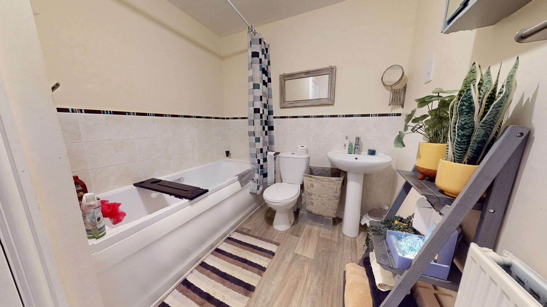 Radiator, Suite comprising pedestal sink, low level WC and bath. Tiling to splash back areas. Vinyl flooring. Airing cupboard.