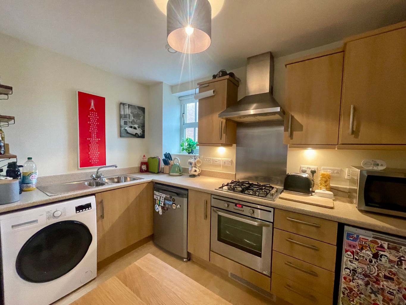 Range of wall and base units. Integrated oven, hob and extractor. Space for white goods. Stainless steel sink and drainer. Boiler.