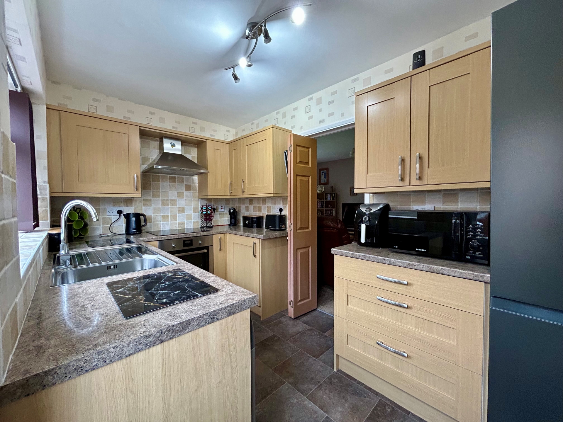 uPVC double glazed window and door to side elevation. Radiator. A range of wall and base units. Integrated oven, electric hob and extractor. Full height tiling. Tiled floor. Stainless steel sink with mixer tap.