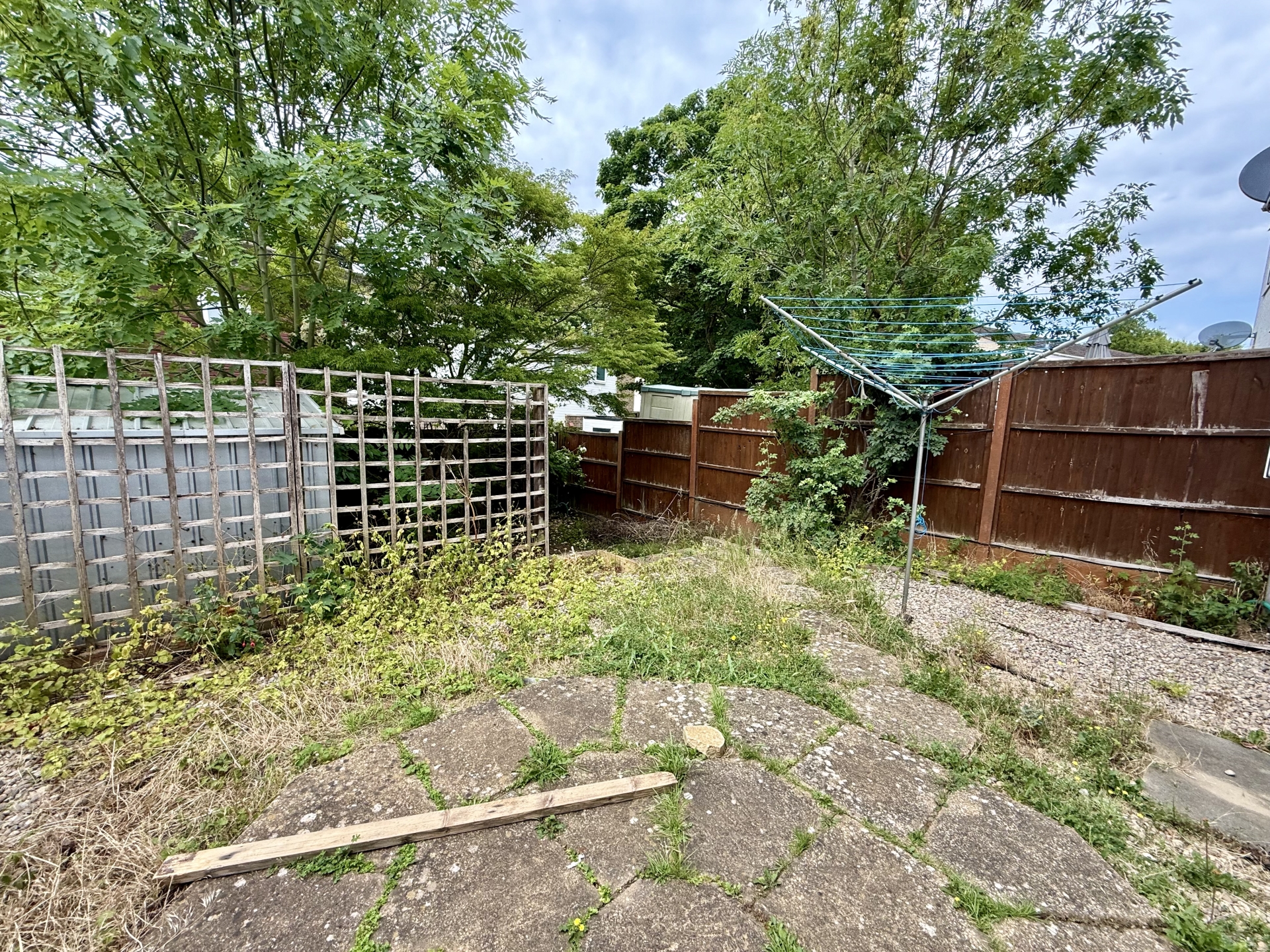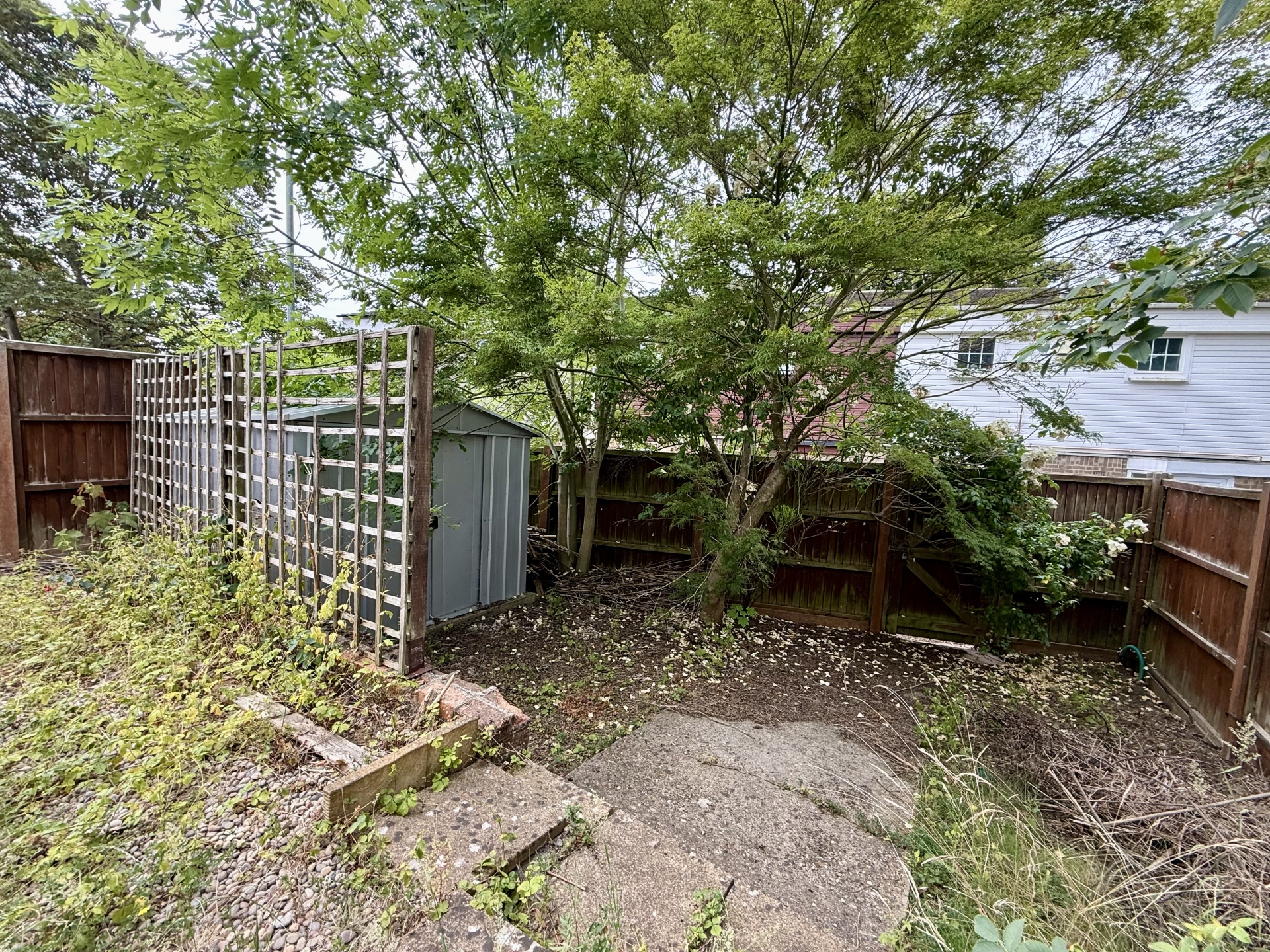 Fenced boundary. Paved area. Steps down to second paved area. Rear access via gate. Mature trees.