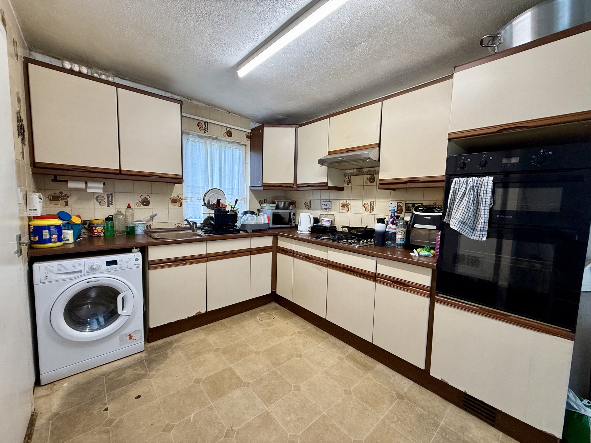 Double glazed window to front elevation. Double glazed patio doors to rear elevation. Two radiators. Sink. Partially tiled. Integrated cooker, hob and extractor. Space for fridge/freezer and washing machine. Storage cupboard.