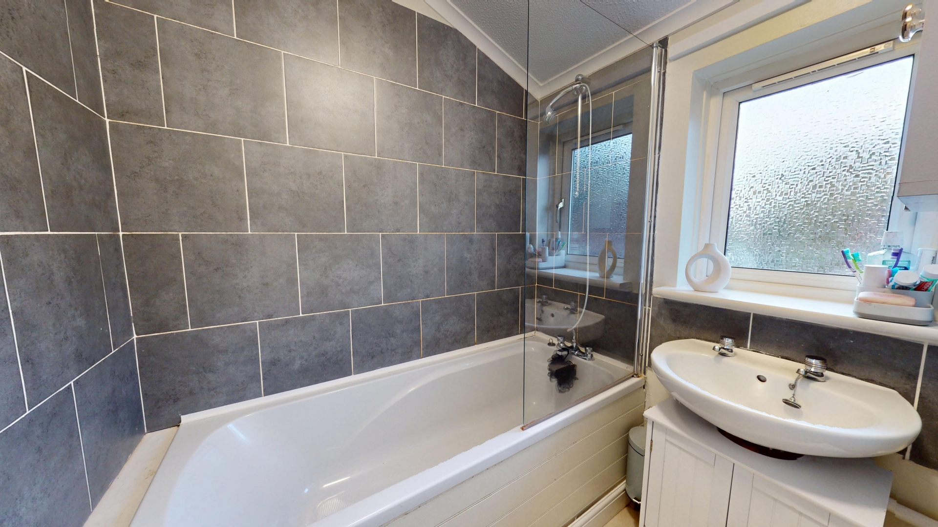 Double glazed obscure glazed window to front elevation. Suite comprising bath with mixer tap and shower attachment and wash hand basin. Part tiled walls. Tiled floor. Coving.