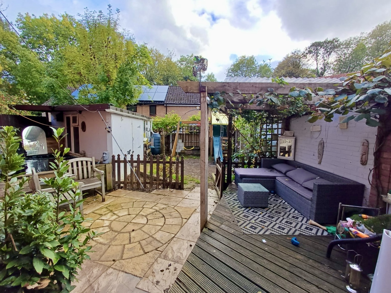 Fully enclosed with fence and wall with side gated access. Timber decked searing area with part covered pergola. Paved patio area. Well stocked borders. Lawn area.