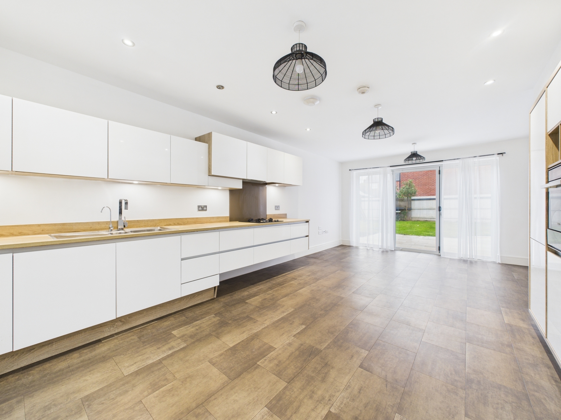 The ground floor welcomes you with a spacious hallway featuring bespoke understairs storage. From here, doors lead to a study and a combined WC/utility room. Opposite, the impressive dual aspect kitchen/dining room provides a superb social hub, fitted with sleek modern units and integrated appliances including an induction hob, extractor, oven, dishwasher, and fridge-freezer. Bi-fold doors open directly onto the garden, while an internal door connects to the generous sitting room, which enjoys two sets of French doors leading to the patio and decked areas.