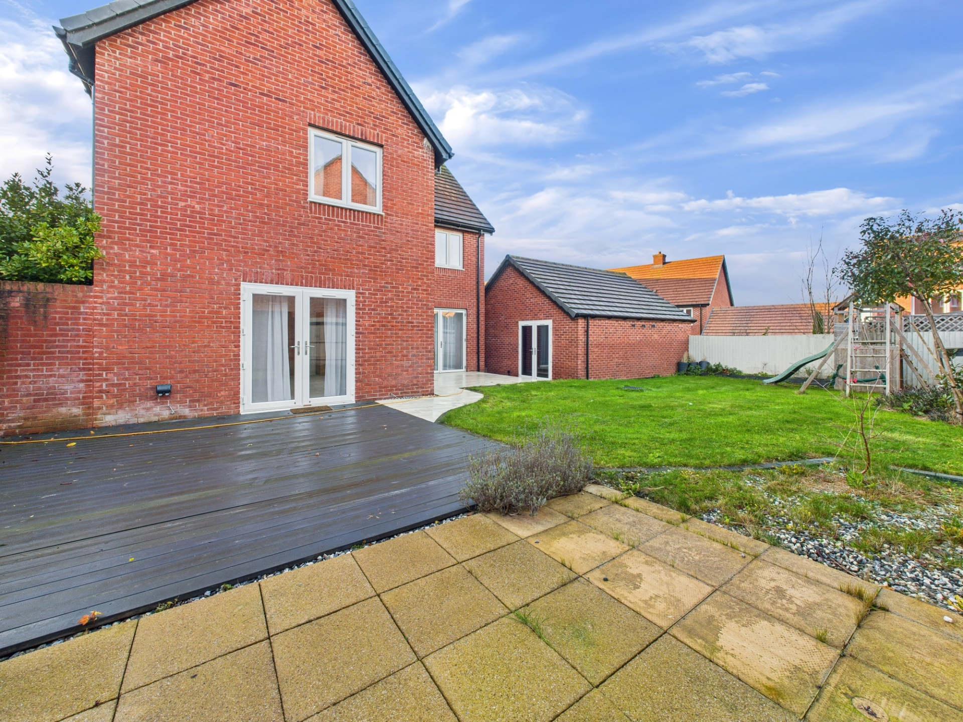 Outside, the property features an attractive front garden and a double width driveway leading to a detached double garage. The rear garden has been thoughtfully landscaped for family enjoyment, with a large paved patio off the kitchen ideal for entertaining, as well as lawned, decked, paved, and gravelled areas offering variety and low maintenance appeal.