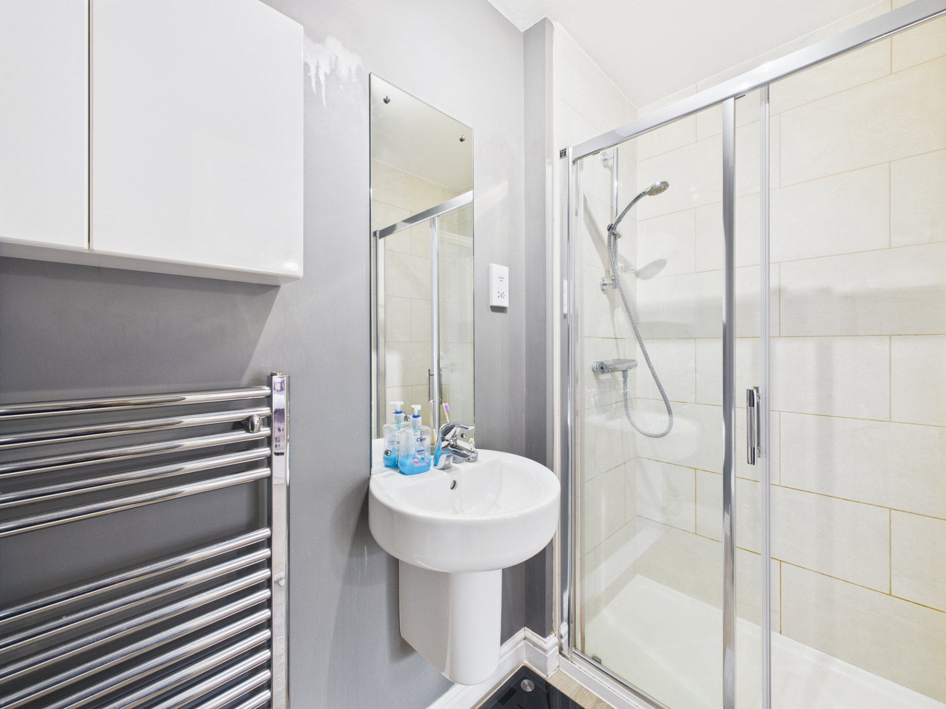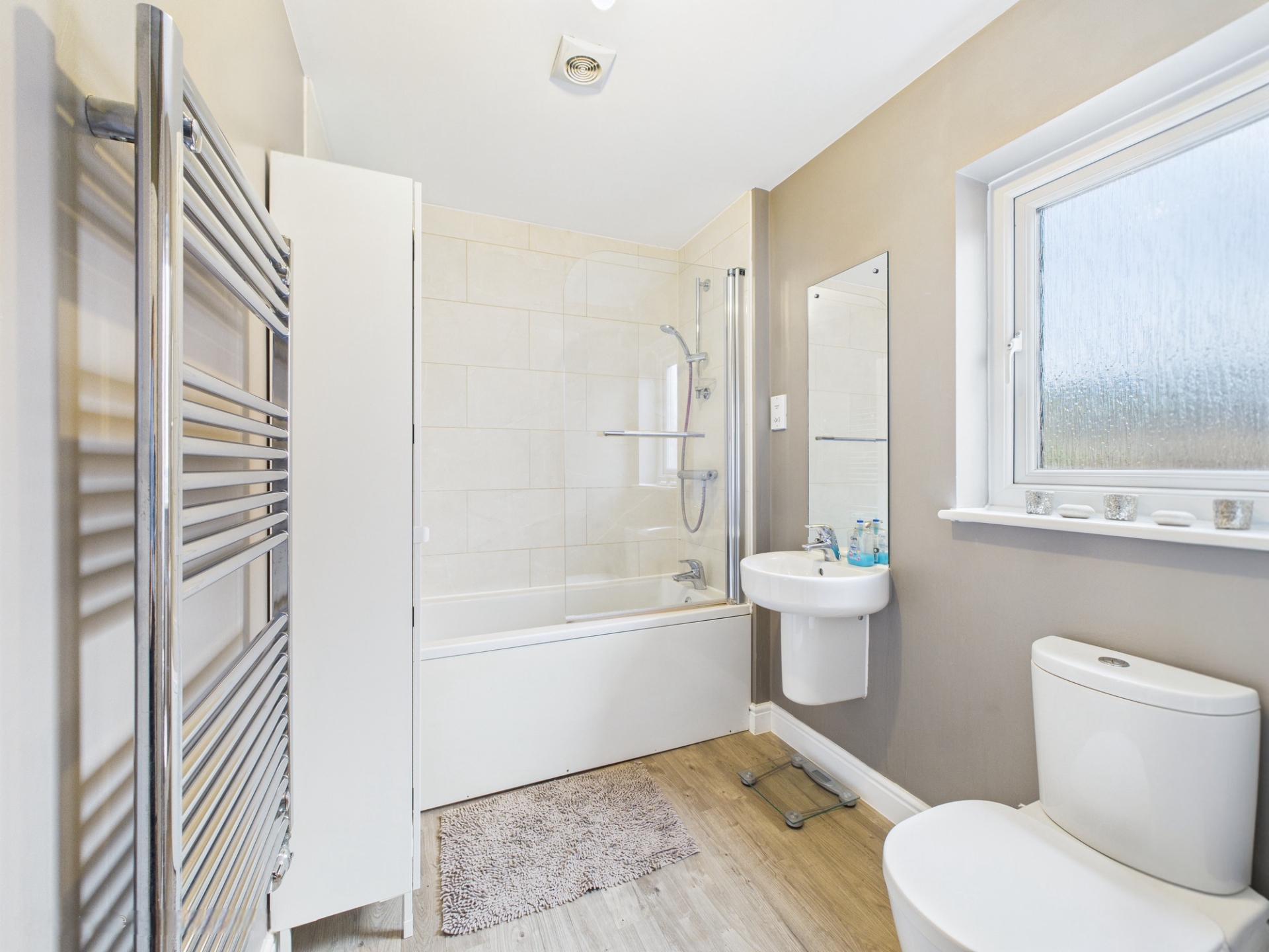 Obscure double glazed window to side elevation. Bath with shower over. Low level WC. Wash hand basin. Cupboard housing pressurised hot water cylinder. Ladder style radiator.