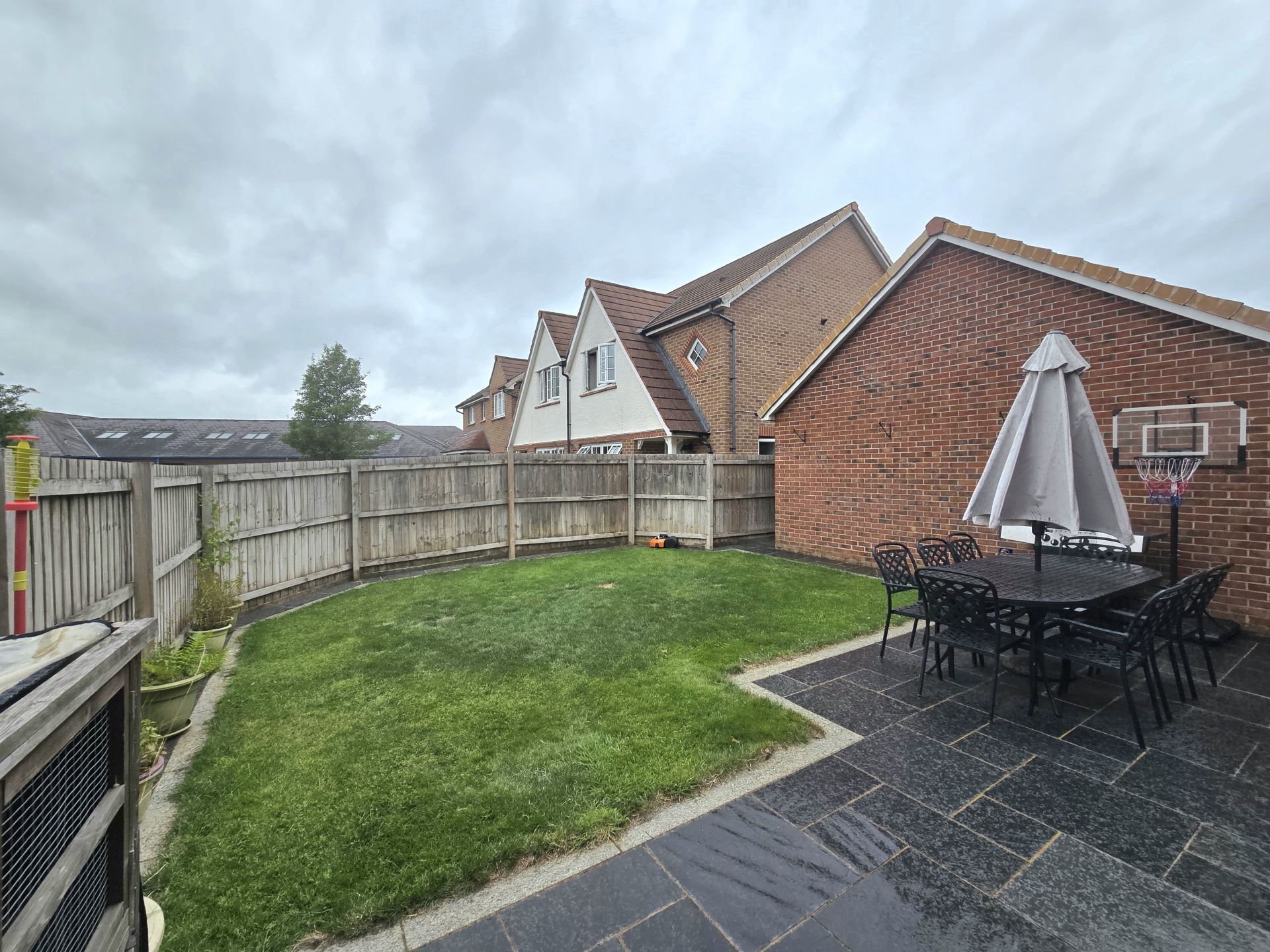 Paved and lawned. Enclosed via panel fencing. Water tap. Side gate.