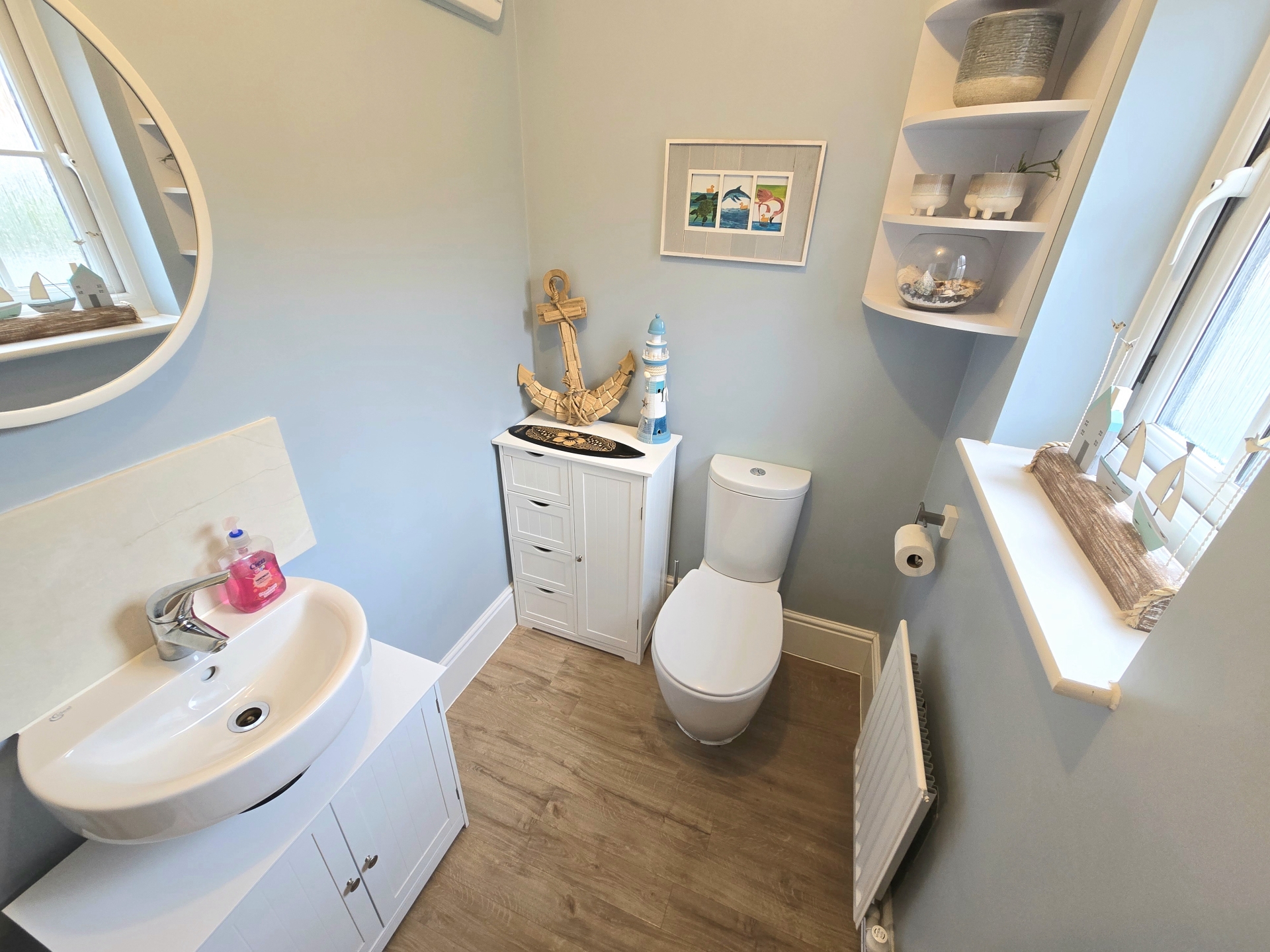 Obscure double glazed window to front elevation. Radiator. Low level WC. Pedestal wash hand basin. Wood effect flooring.