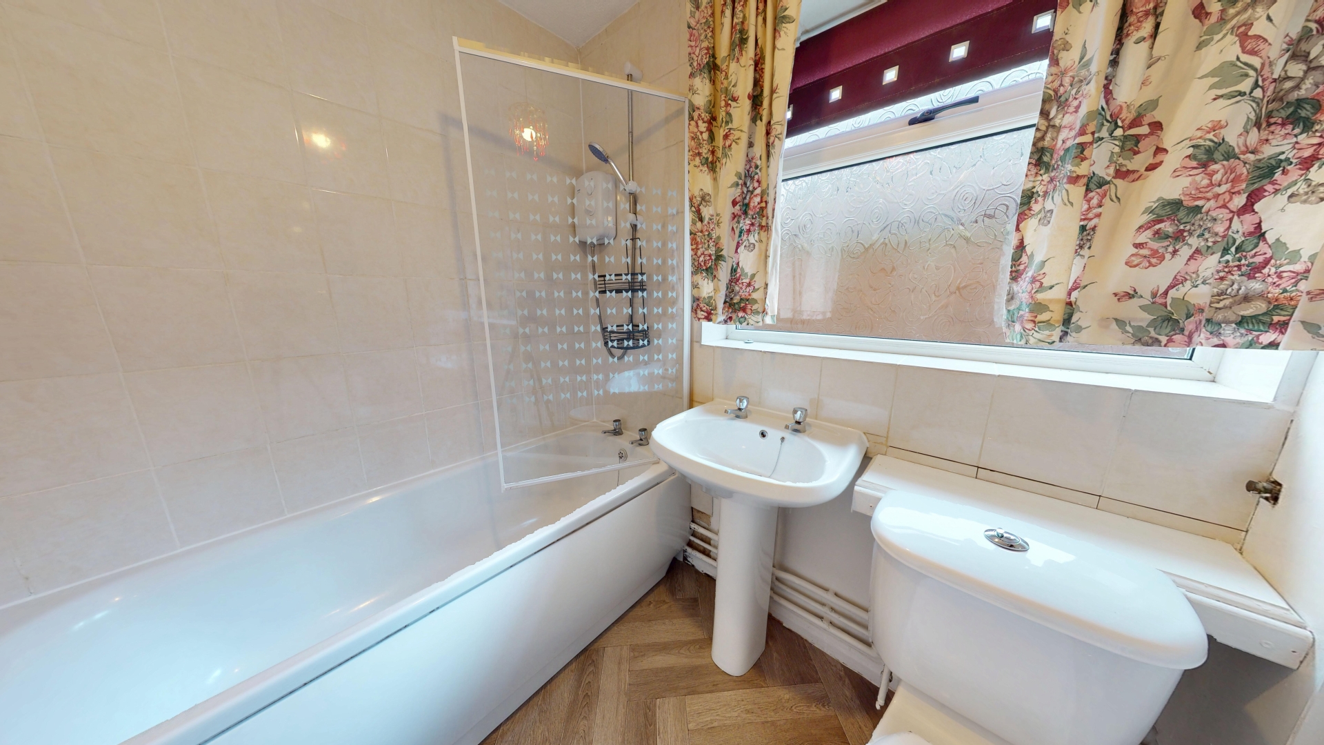 Double glazed obscure window to side elevation. Radiator. Bath with electric shower over. Wash hand basin. Low level WC. Fully tiled walls.