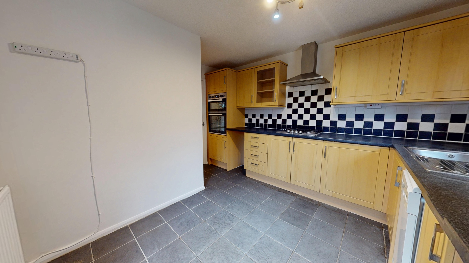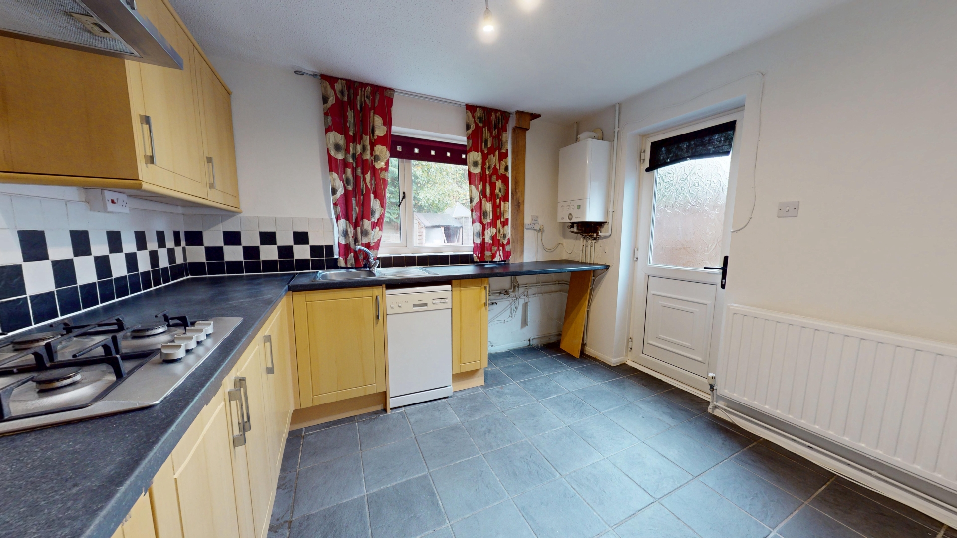 Double glazed window to rear elevation. Double glazed part obscure door to side. Fitted with a range of wall mounted and base units. with work surface over. Tiled splashbacks. Stainless steel sink with mixer tap and drainer. Plumbing for slimline dishwasher and washing machine. Built in gas hob with extractor hood over. Double electric oven. Space for fridge. Wall mounted hot water and central heating boiler.