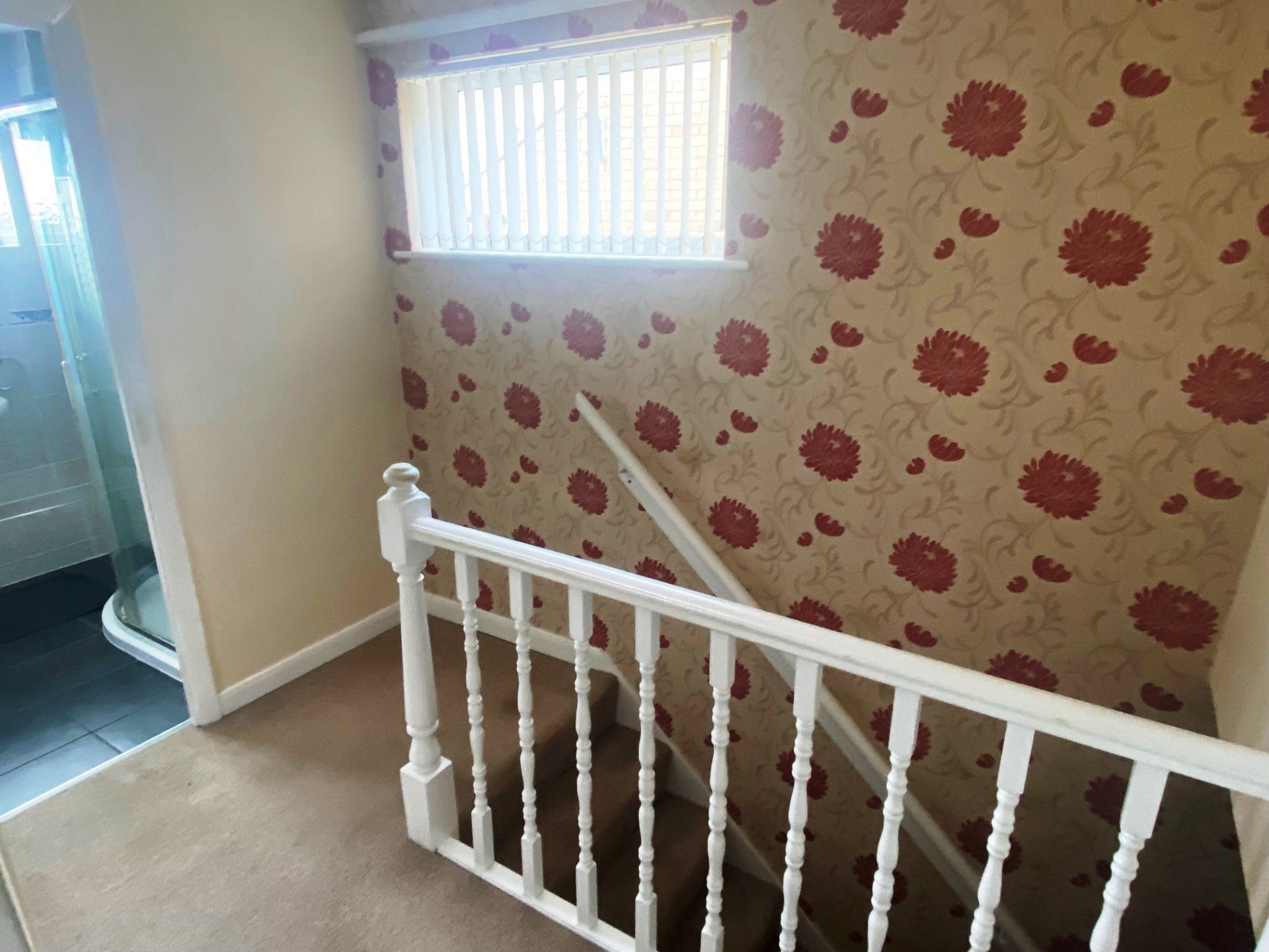 Obscure uPVC double glazed window to rear elevation. Chrome heated towel rail. A white refitted three piece suite comprising low level WC, pedestal wash hand basin and double shower cubicle with power shower. Fully tiled. Extractor fan.