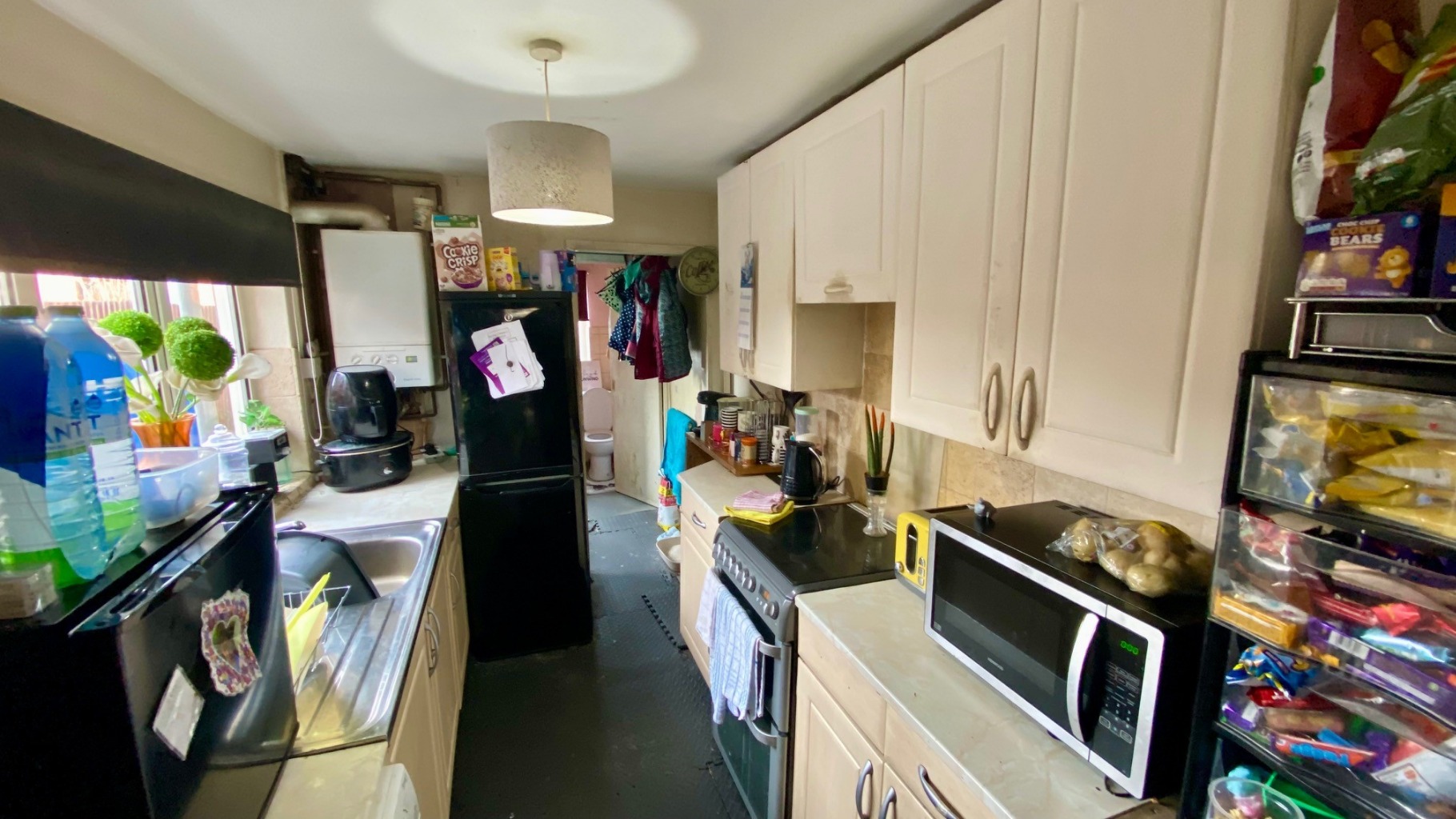 Double glazed window to side elevation. Wall and base units. Single drainer stainless steel sink unit. Wall mounted gas fired boiler.