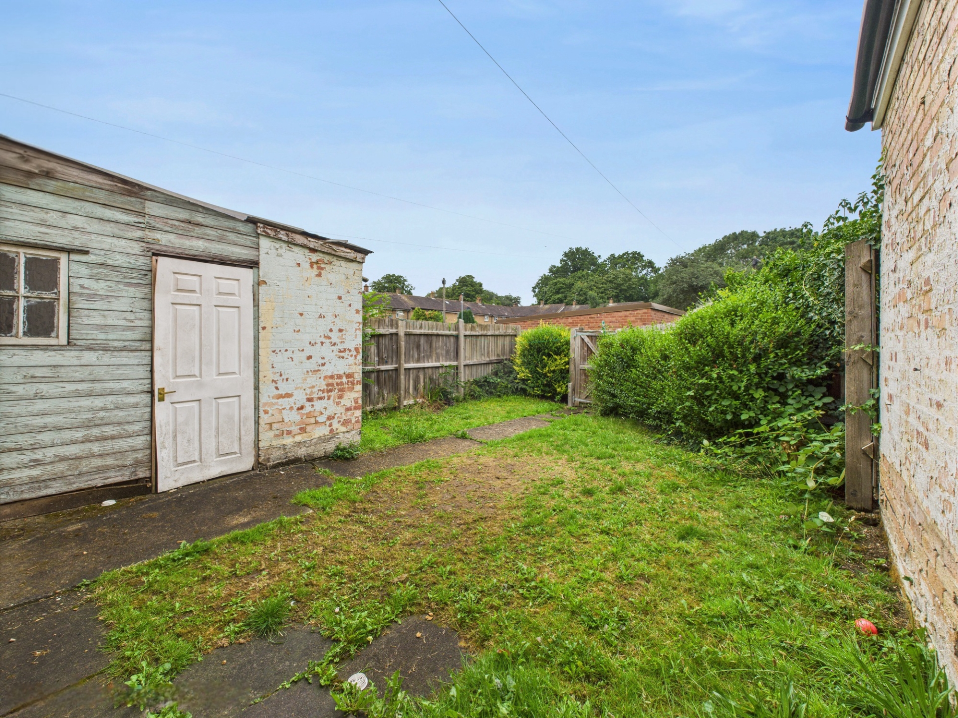 Timber door leading to garden. Obscure glazed window to side elevation. Access to outdoor storage shed.