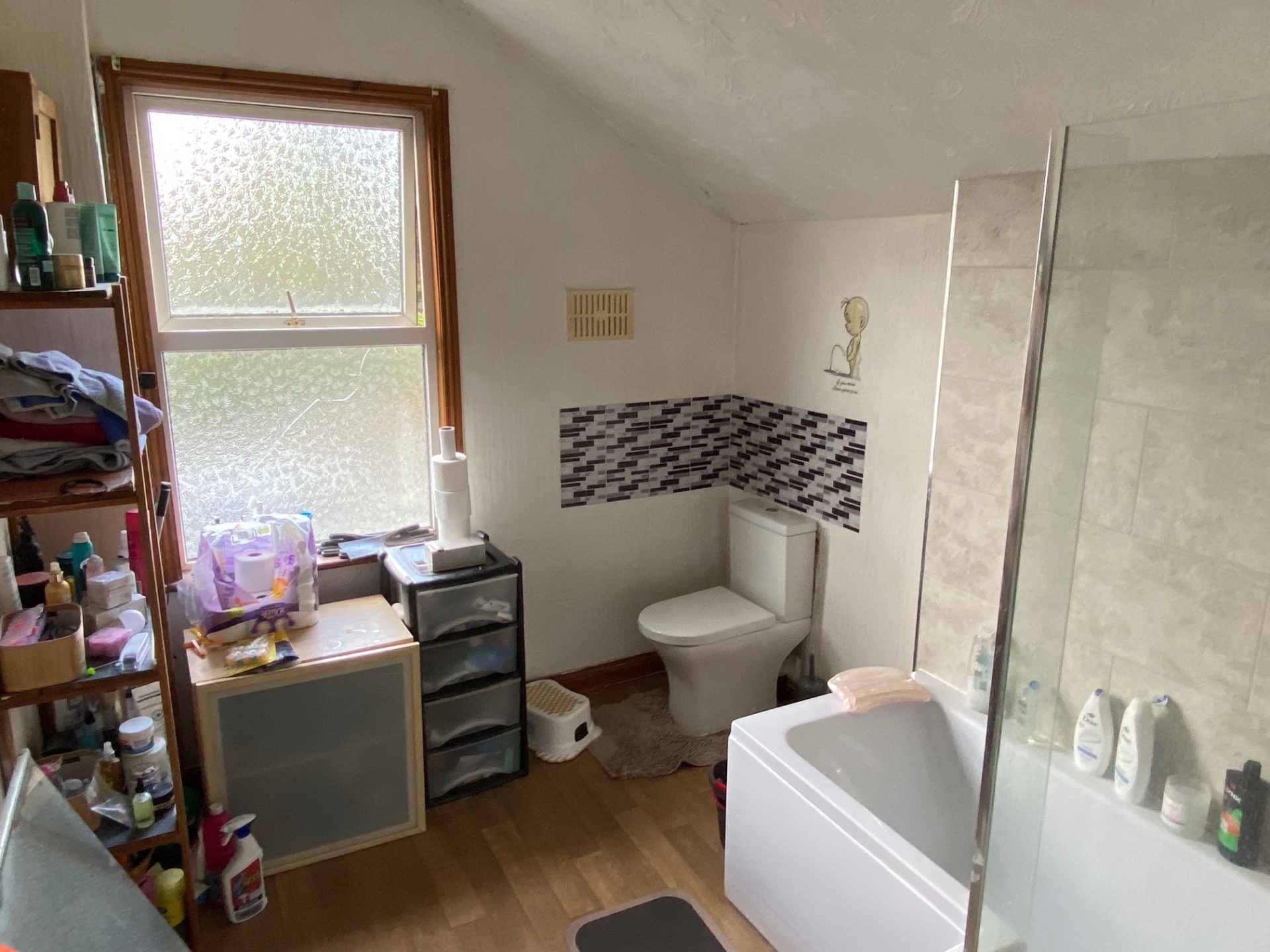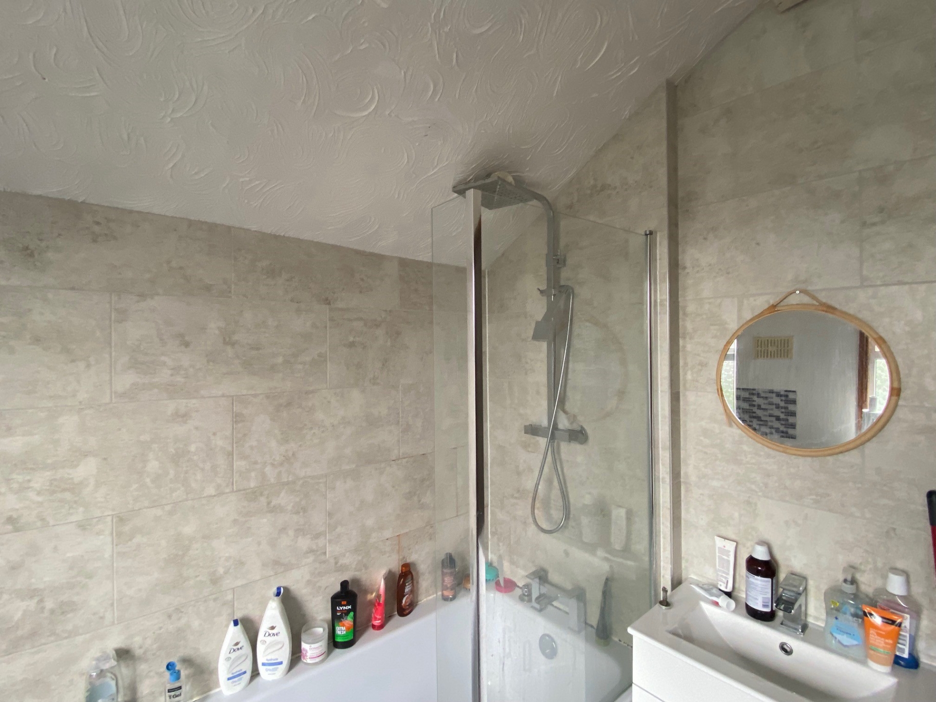 Obscure double glazed window to rear elevation. Radiator. 'P' shaped bath with shower over. Wash hand basin in vanity unit. Low level WC.