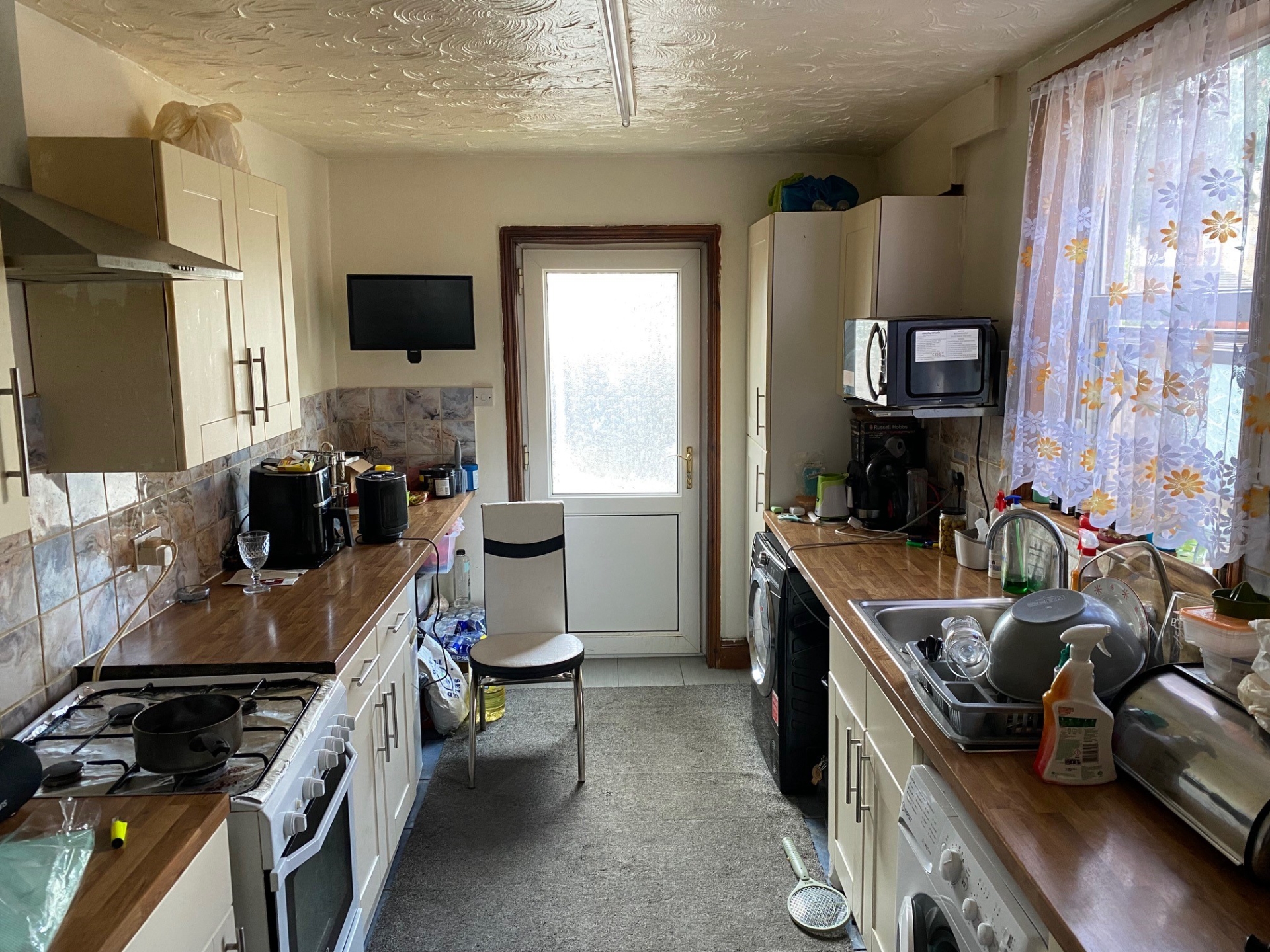 Obscure double glazed door to rear and obscure window to side elevation. Base and wall mounted units with work surface over. Stainless steel sink and drainer with mixer tap over. Tiled splashback. Cupboard housing gas fired combination boiler. Space for under counter appliances and upright fridge freezer.