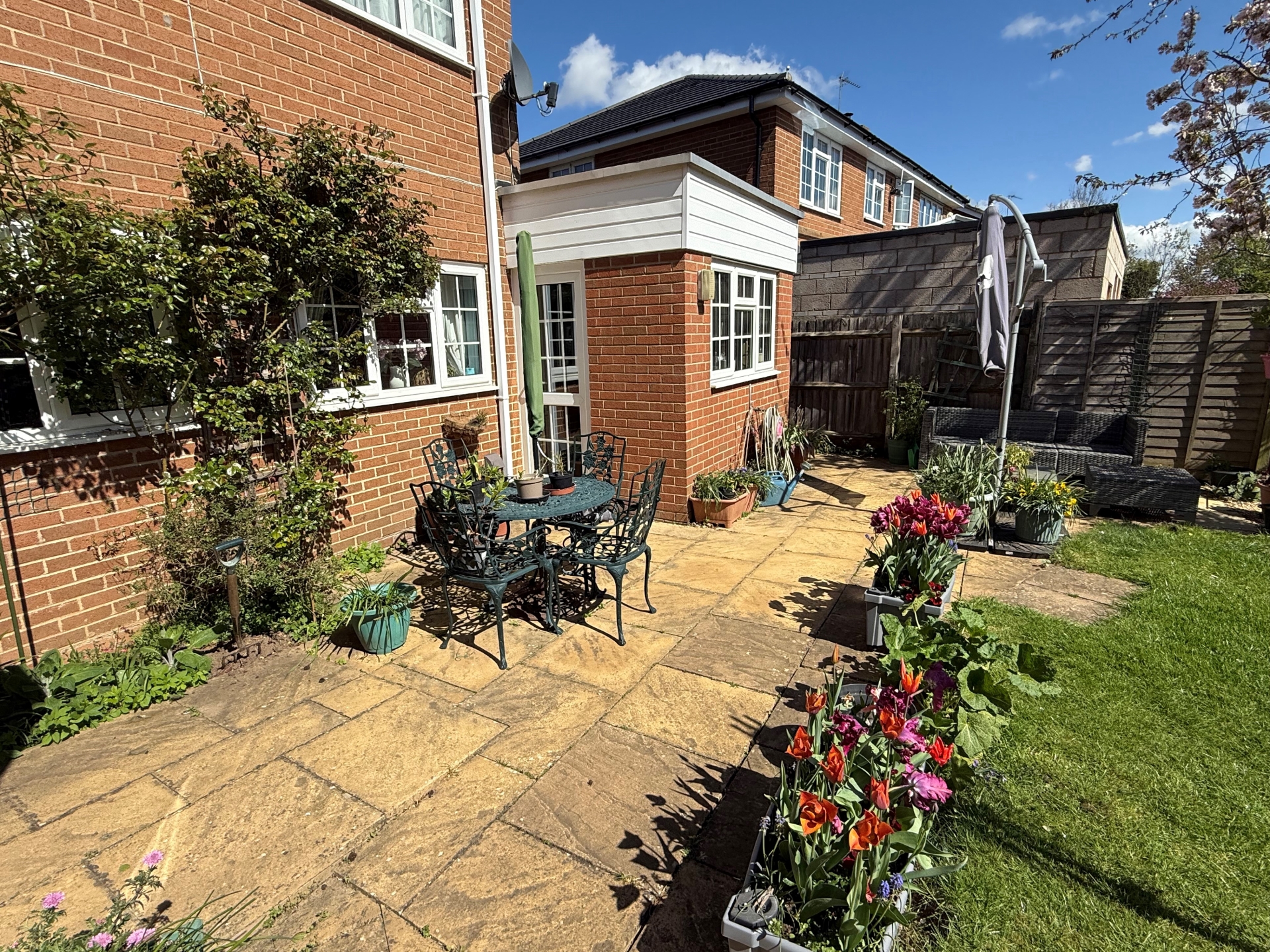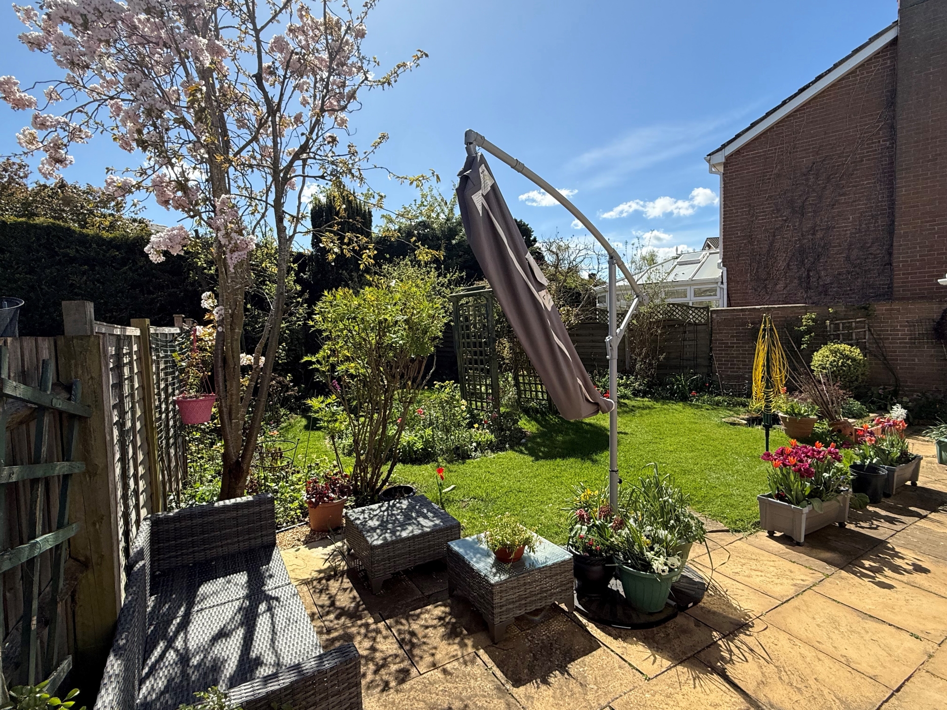 Enclosed by panel fencing. Patio. Well cared for borders. Lawn. Pond. Side access. Side structure with greenhouse and shed enclosed by a wall. Mature trees and shrubs. Outside tap.